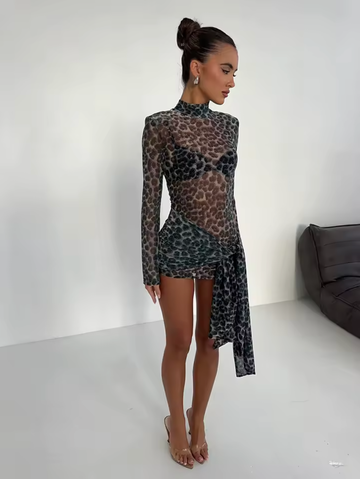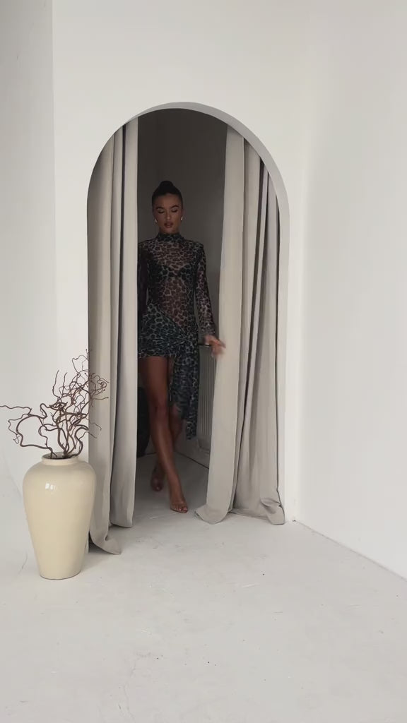 Kelina is the ultimate showstopper for any event, guaranteed to make a statement. This mini dress features a figure-hugging sheer mesh material adorned with a bold and eye-catching abstract animal print in a glittery finish. The high neckline and long sleeves add an elegant touch, while the ruched side drape detail accentuates your curves for a flattering and confident look.