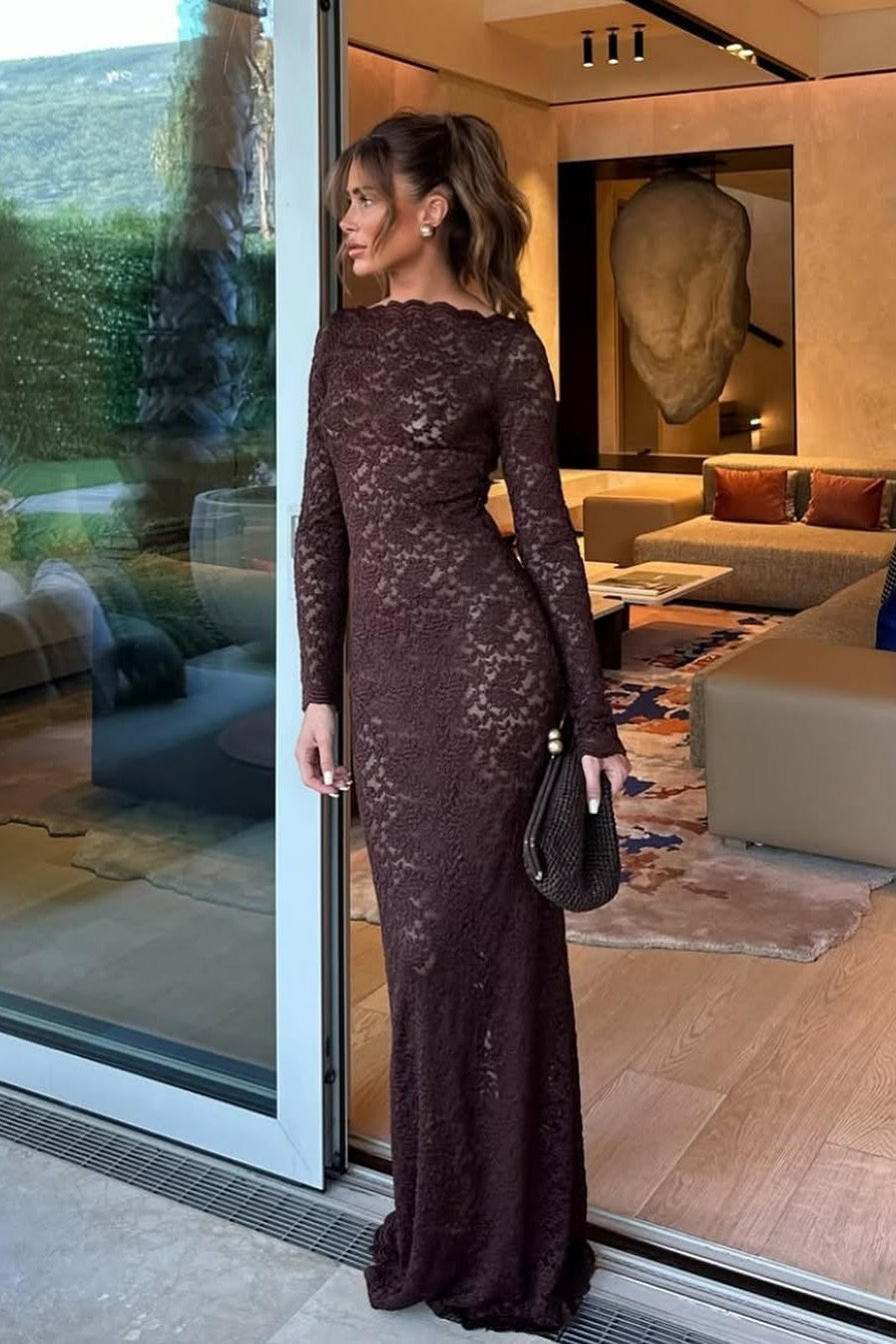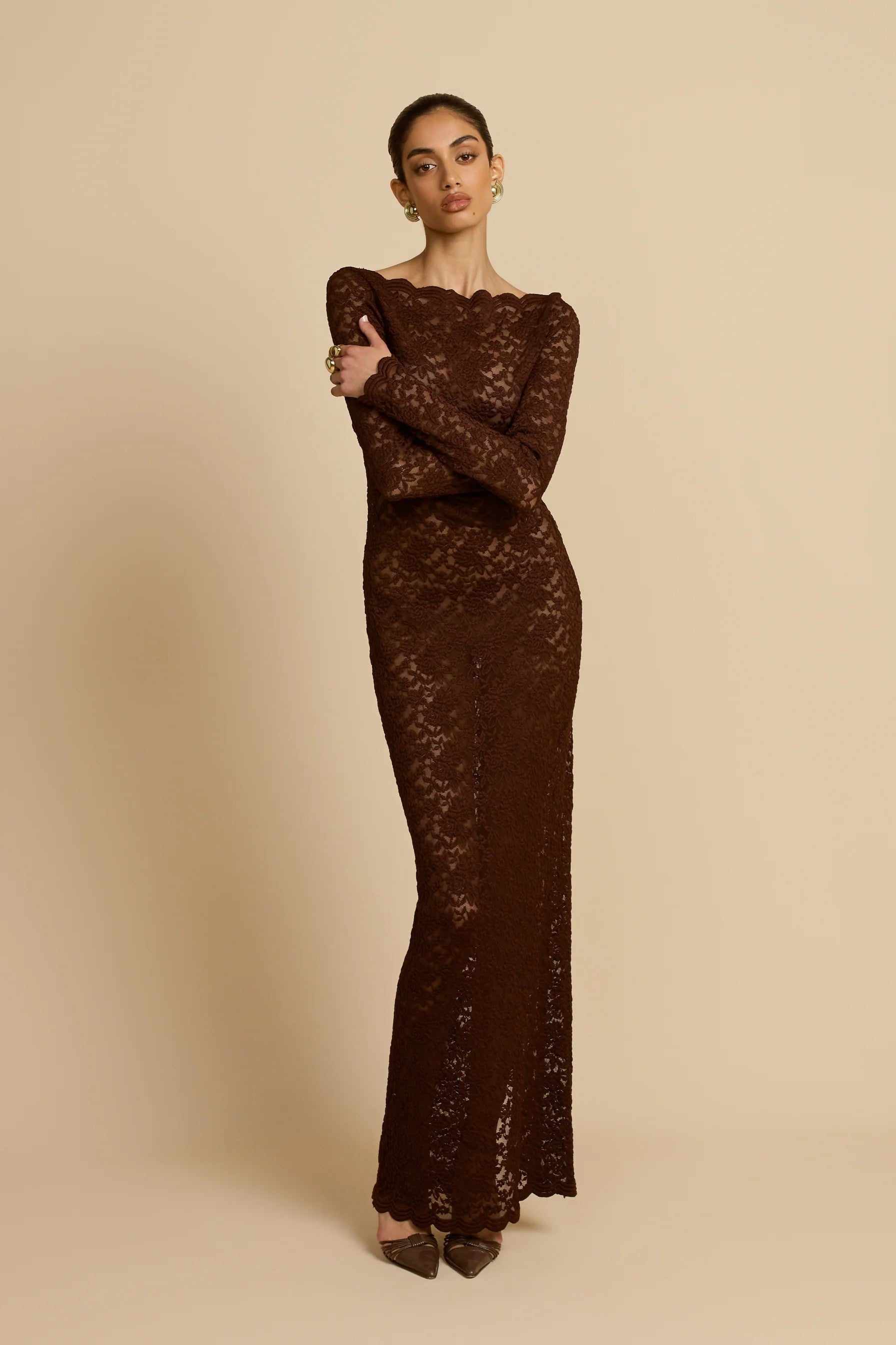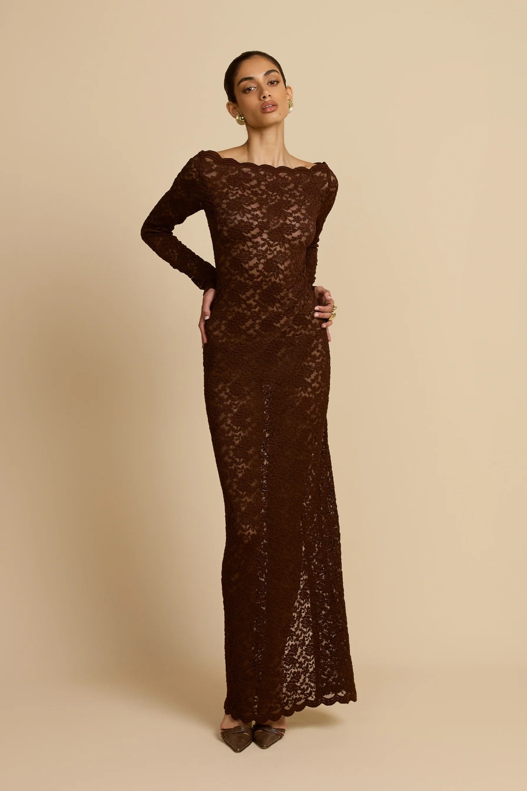 Channel effortless sophistication with Lisara, a striking maxi dress designed to celebrate timeless elegance. Crafted from delicate lace, this figure-skimming silhouette beautifully contours the body while offering an alluring balance of romance and confidence. The off-shoulder neckline highlights the décolletage, complemented by long fitted sleeves that add a touch of refined drama. Flowing into a floor-length hem, Lisara is perfect for elevated evenings, formal occasions, or moments that call for understated glamour.