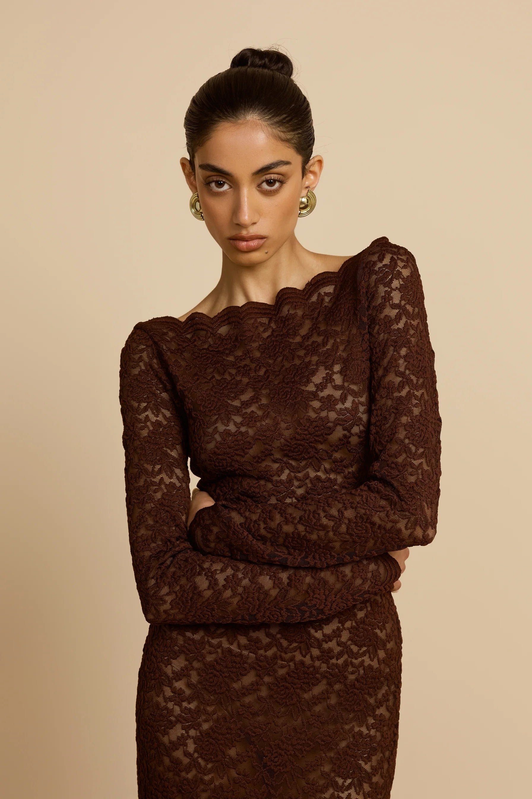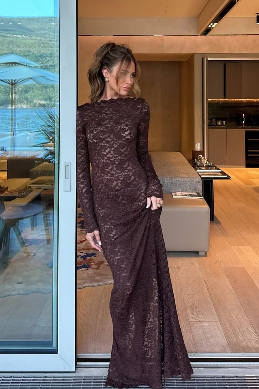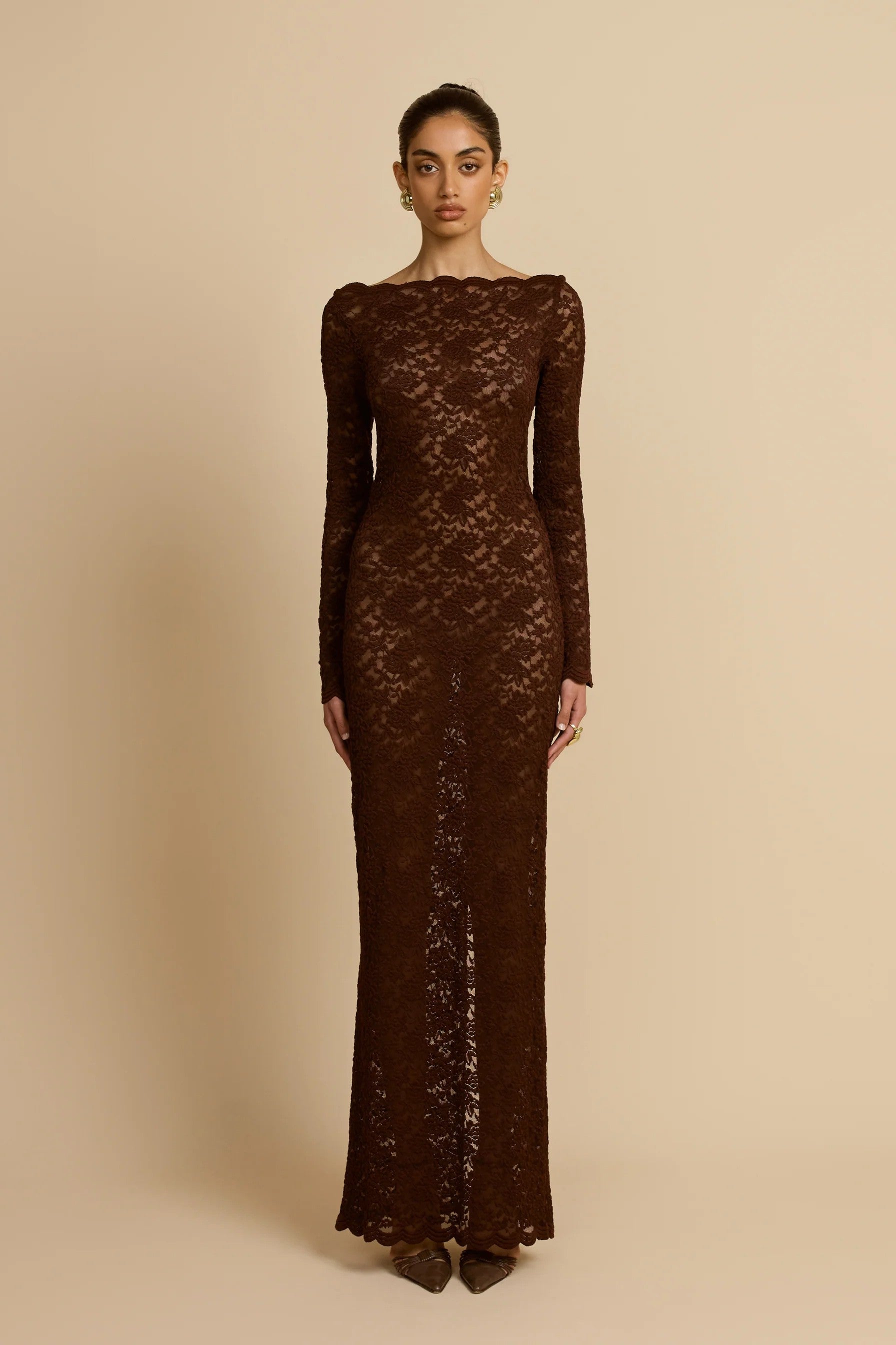 Channel effortless sophistication with Lisara, a striking maxi dress designed to celebrate timeless elegance. Crafted from delicate lace, this figure-skimming silhouette beautifully contours the body while offering an alluring balance of romance and confidence. The off-shoulder neckline highlights the décolletage, complemented by long fitted sleeves that add a touch of refined drama. Flowing into a floor-length hem, Lisara is perfect for elevated evenings, formal occasions, or moments that call for understated glamour.