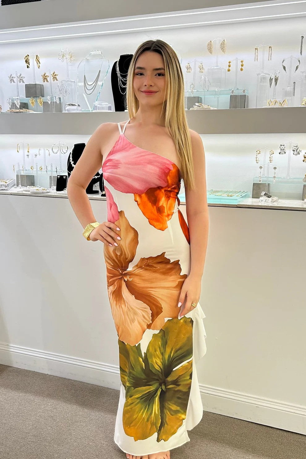Radiate quiet luxury with Velara, a stunning one-shoulder maxi dress designed for women who appreciate refined beauty and fluid sophistication. Crafted from a smooth, lightweight fabric, Velara showcases an oversized watercolor floral print that blends art and fashion into one captivating piece. The asymmetrical neckline adds a graceful, modern touch, while the cascading hemline creates soft movement with every step. Perfect for coastal getaways, garden celebrations, or elevated daytime events, Velara is your invitation to embrace beauty in its most natural form.