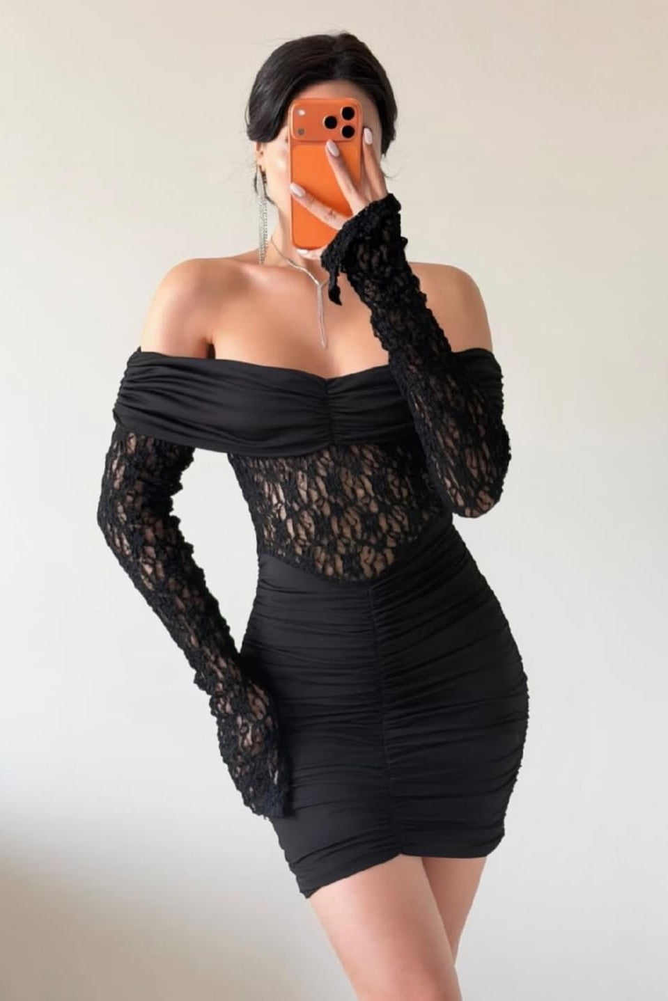 Showcase your confidence and captivate every room with Sauline, a sultry off-shoulder mini dress crafted for women who love striking, elegant, and undeniably bold fashion. This show-stopping piece blends luxurious ruching with delicate lace to create a silhouette that is both romantic and daring.