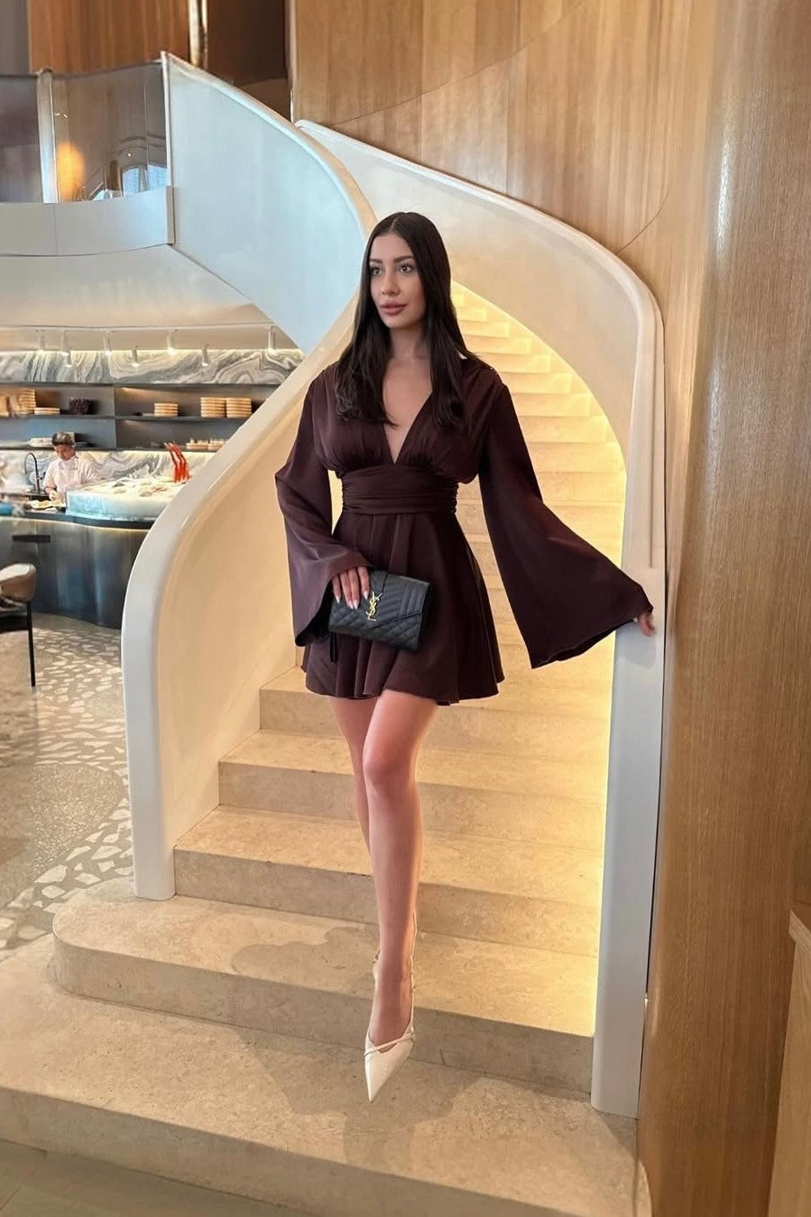 Radiate effortless elegance in Zirela, a captivating mini dress that blends romantic charm with modern sophistication. Crafted from lustrous satin, this piece features a plunging V-neckline and voluminous long sleeves that drape beautifully with every movement. The cinched waistband accentuates your figure, while the open back with tie detailing adds a touch of allure. With its fluid A-line skirt, Zirela is perfect for evenings that call for both grace and confidence.