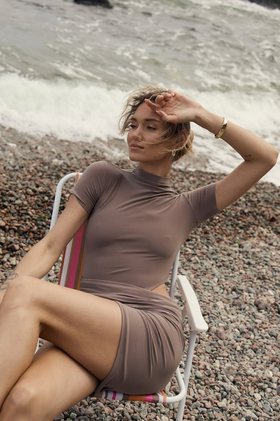 Dare to stand out with Belia, a bold mini dress designed to accentuate your curves with modern edge. Featuring a sleek high neckline balanced by daring cut-out sides, this dress combines simplicity with sultry detail. The draped, ruched skirt creates a sculpted fit, ensuring movement and shape that flatter the figure. Perfect for nights when you want to make an unforgettable impression, Belia is the definition of contemporary allure.