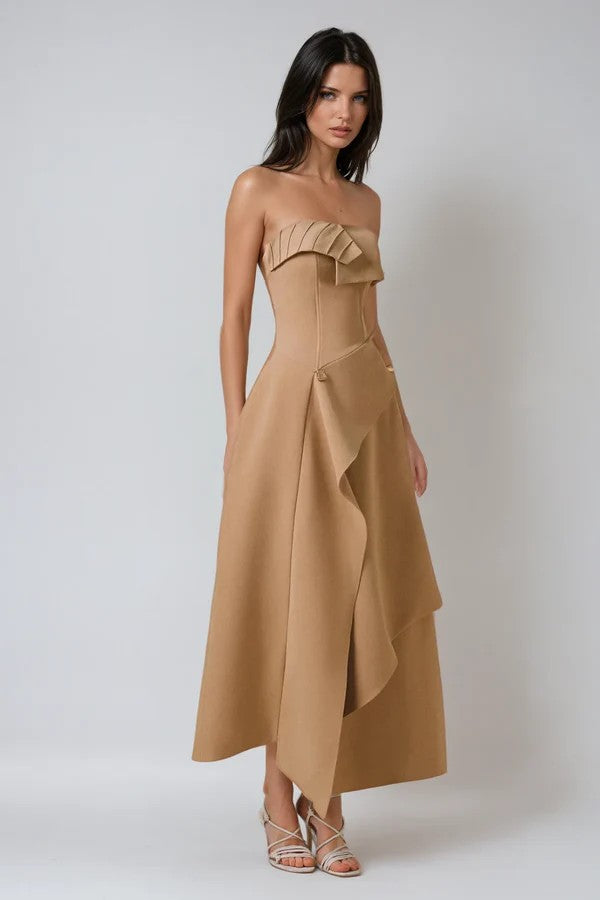 Make an impression that lasts with Bobbie. A masterpiece of structure and sophistication, Bobbie embodies understated luxury with its sculpted silhouette and architectural design. The strapless neckline is accentuated by a pleated bust detail that adds depth and femininity, while the asymmetrical layered skirt drapes gracefully to create movement and modern allure. Tailored to perfection, this dress captures the essence of refined confidence — ideal for elegant soirées, formal dinners, or any moment that calls for timeless poise.