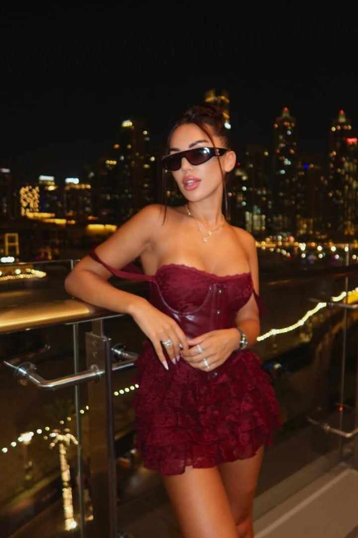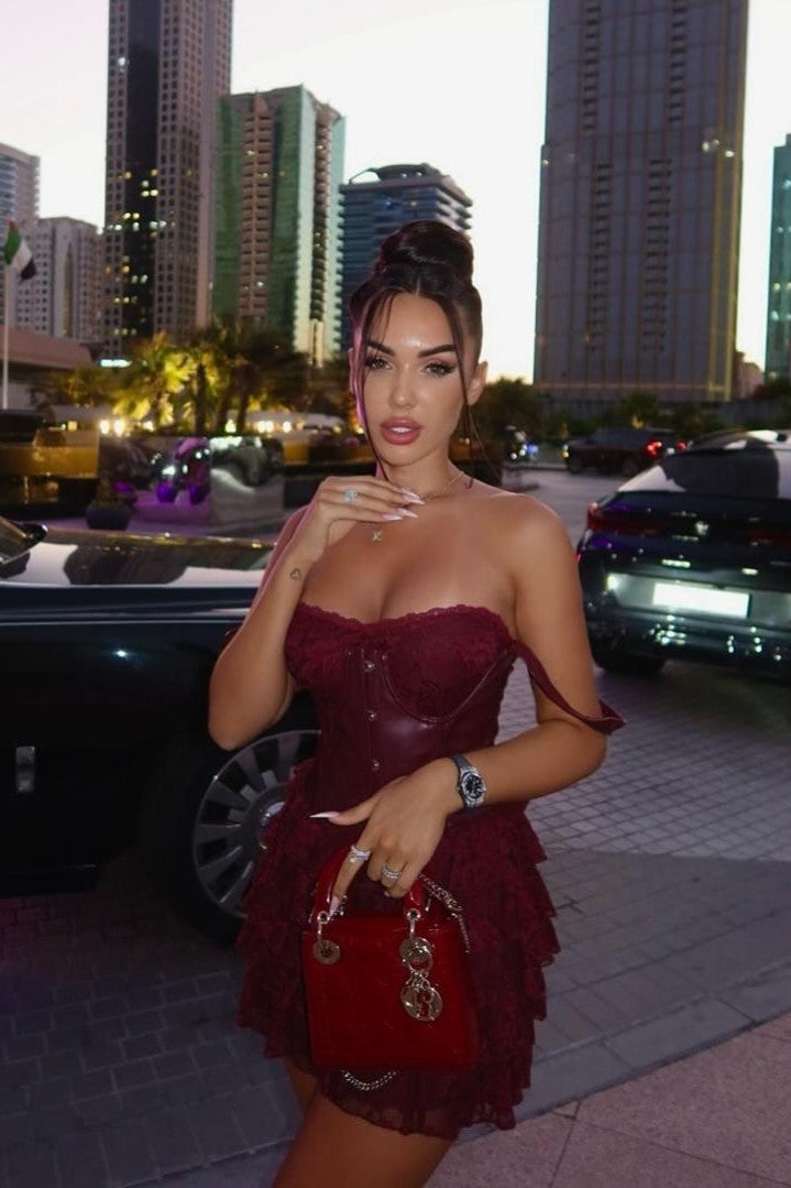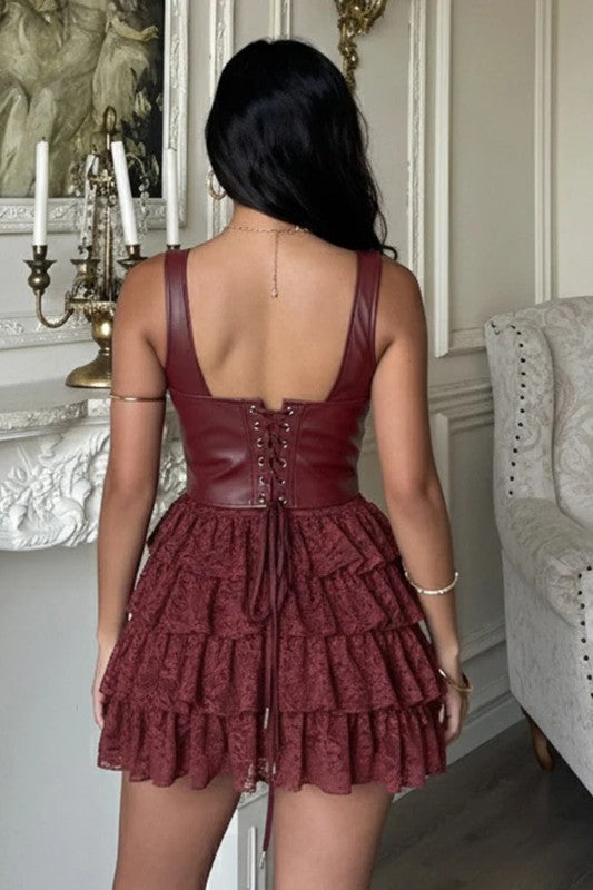 Reveal your daring and feminine vibe with Daphne, a standout mini dress that mixes seductive charm with romantic flair. Its structured faux leather corset bodice, trimmed with lace cups, shapes your waist and flatters your figure. Bold wide straps accentuate your shoulders for an elegant yet commanding style, while the tiered lace ruffle skirt adds a fun, dramatic bounce. Made to impress, Daphne is your perfect pick for evenings that demand fearless sparkle and style.