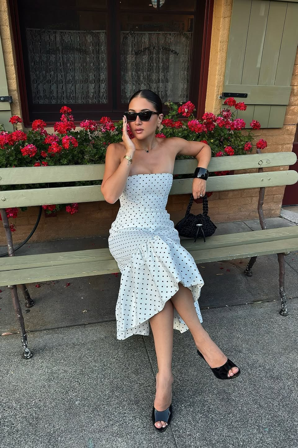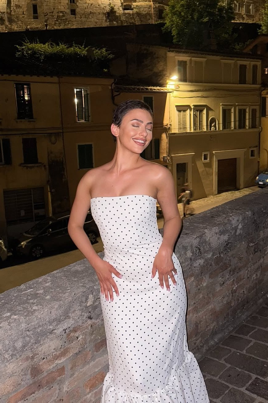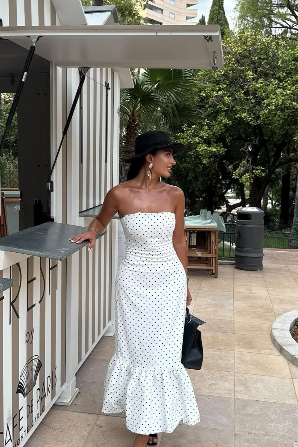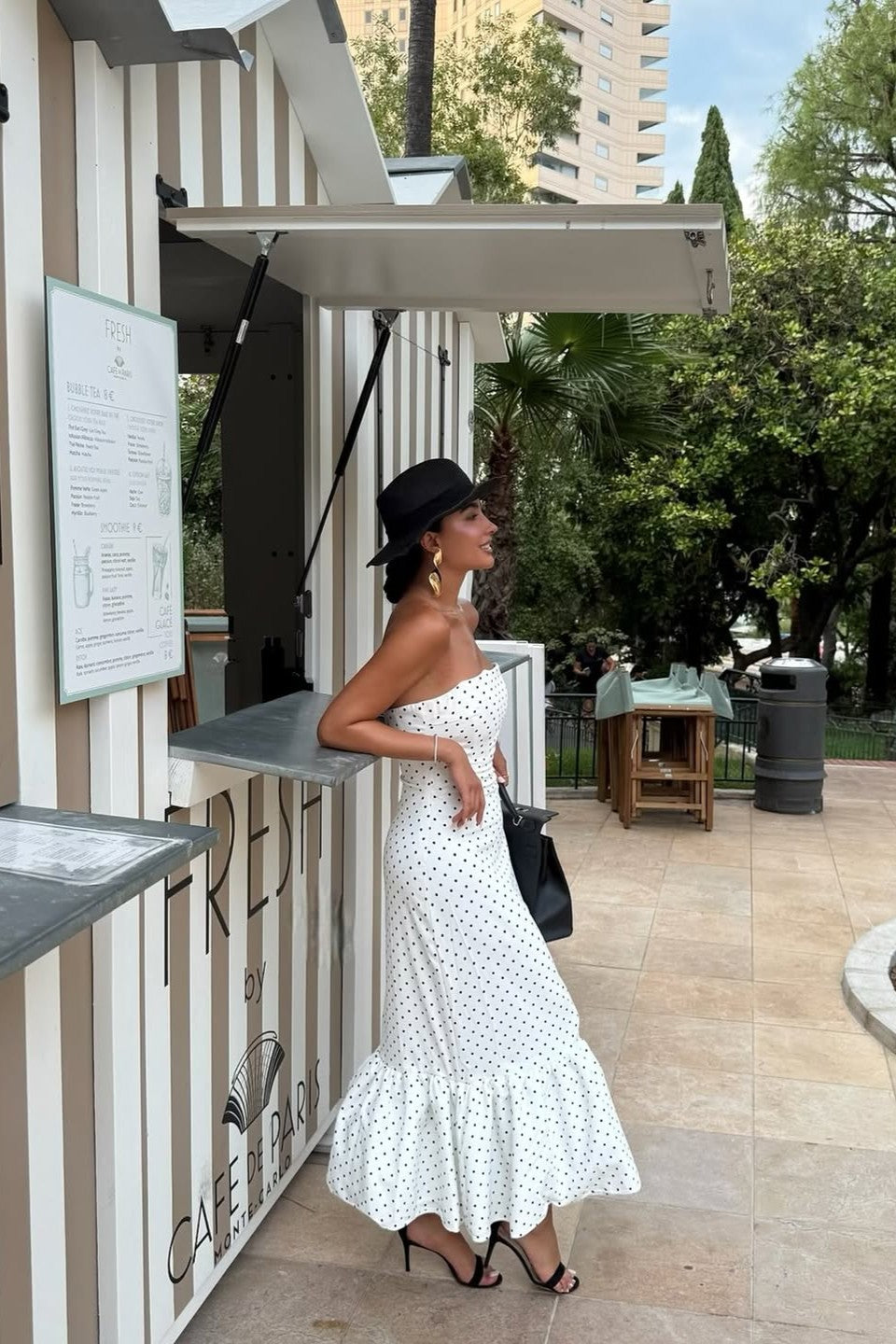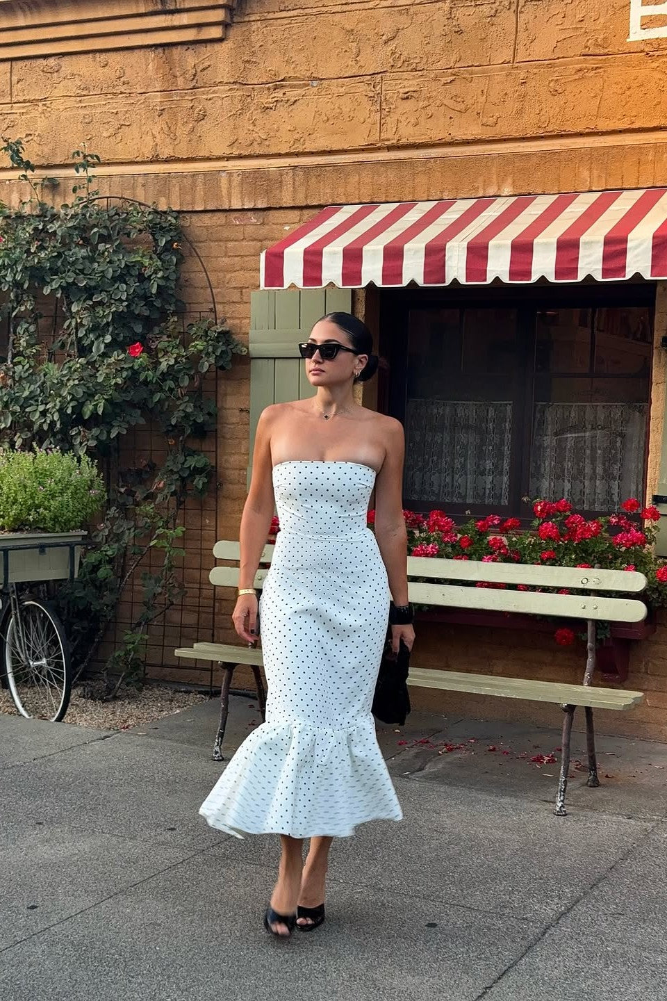 Slip into the playful elegance of Dulza, a strapless midi dress made to celebrate your natural femininity. Its premium stretch fabric gently embraces your curves, while the cheerful polka dot design adds a sweet vintage twist. With a flared hem that dances with your every move, Dulza is ideal for garden get-togethers, evening parties, or stylish urban outings.