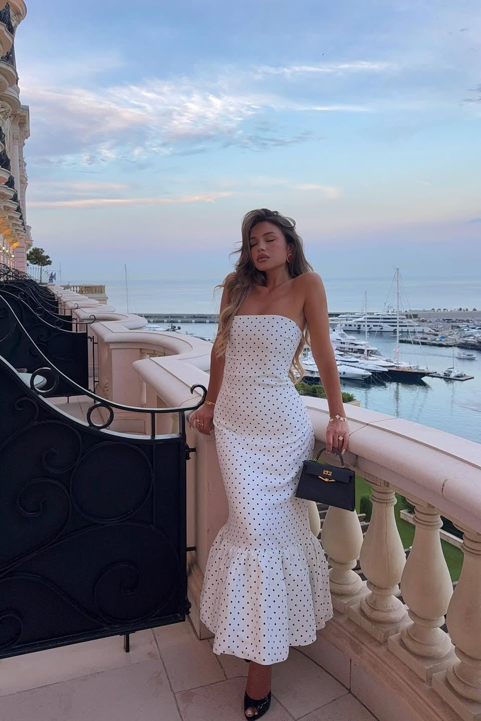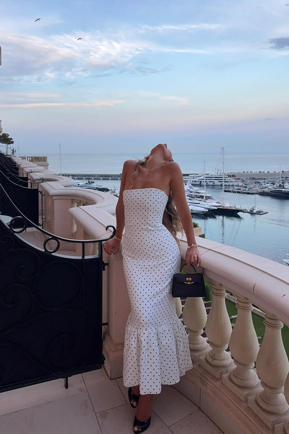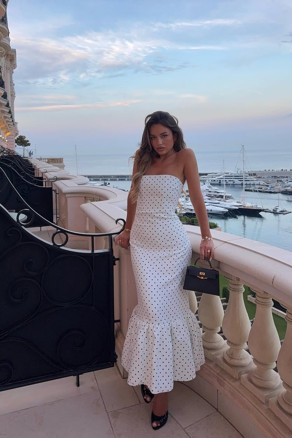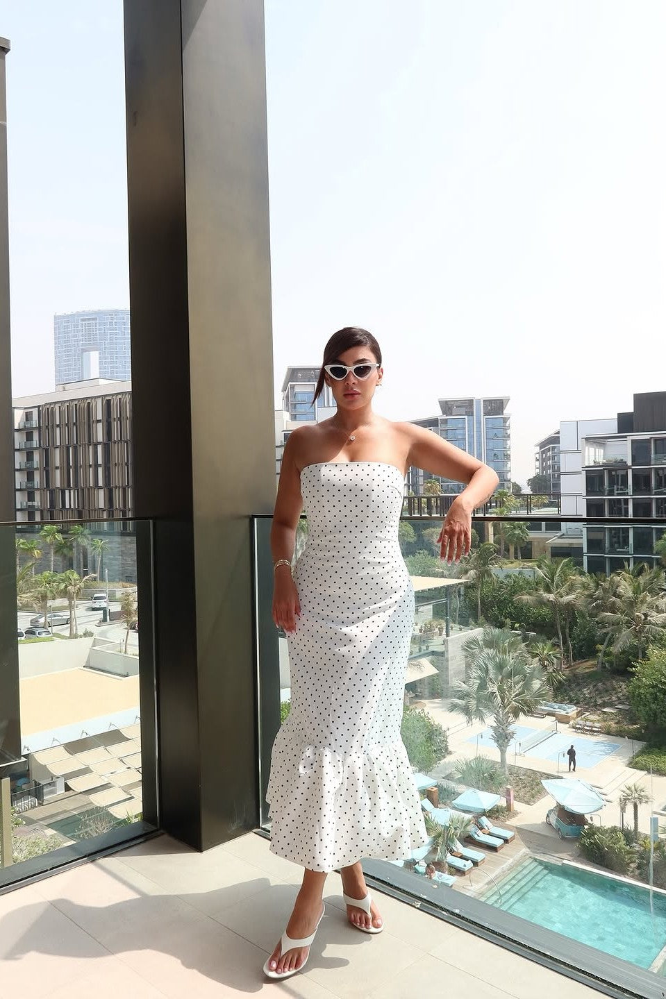 Slip into the playful elegance of Dulza, a strapless midi dress made to celebrate your natural femininity. Its premium stretch fabric gently embraces your curves, while the cheerful polka dot design adds a sweet vintage twist. With a flared hem that dances with your every move, Dulza is ideal for garden get-togethers, evening parties, or stylish urban outings.