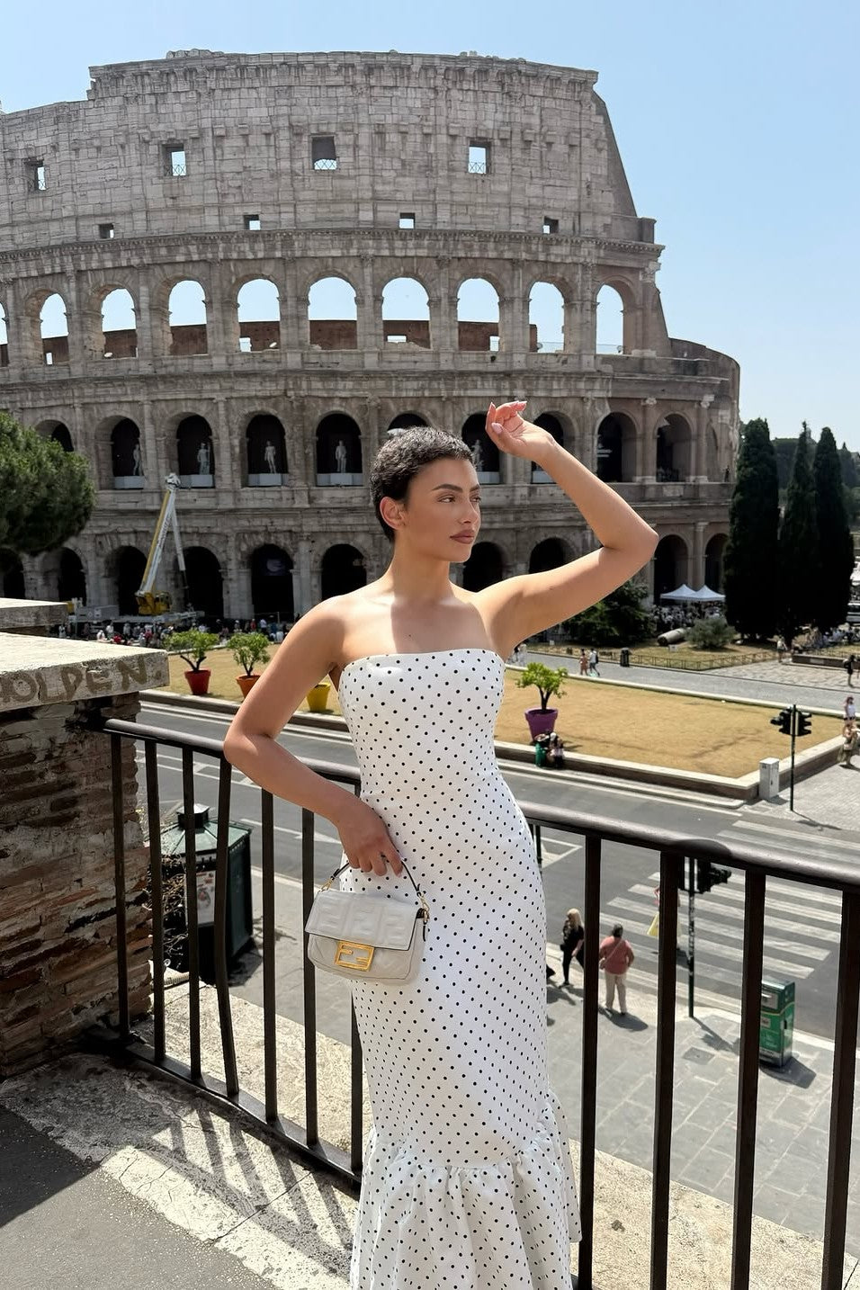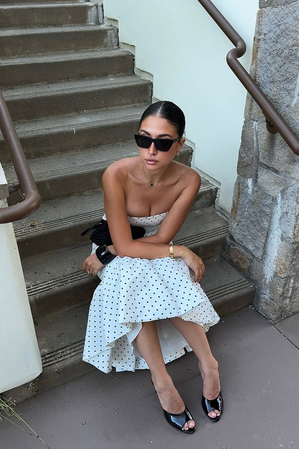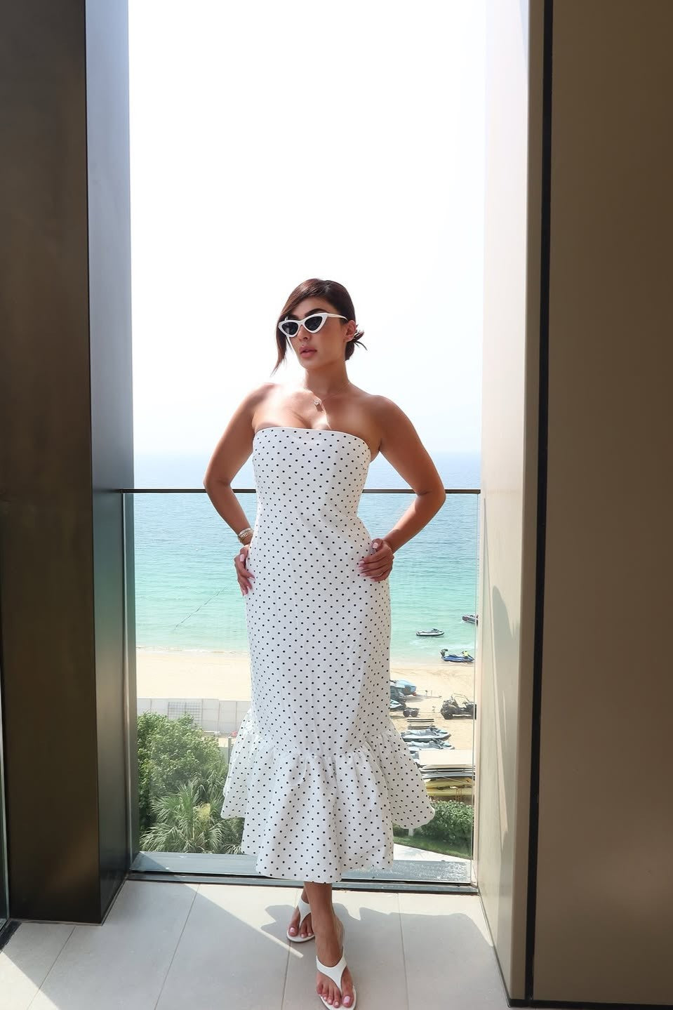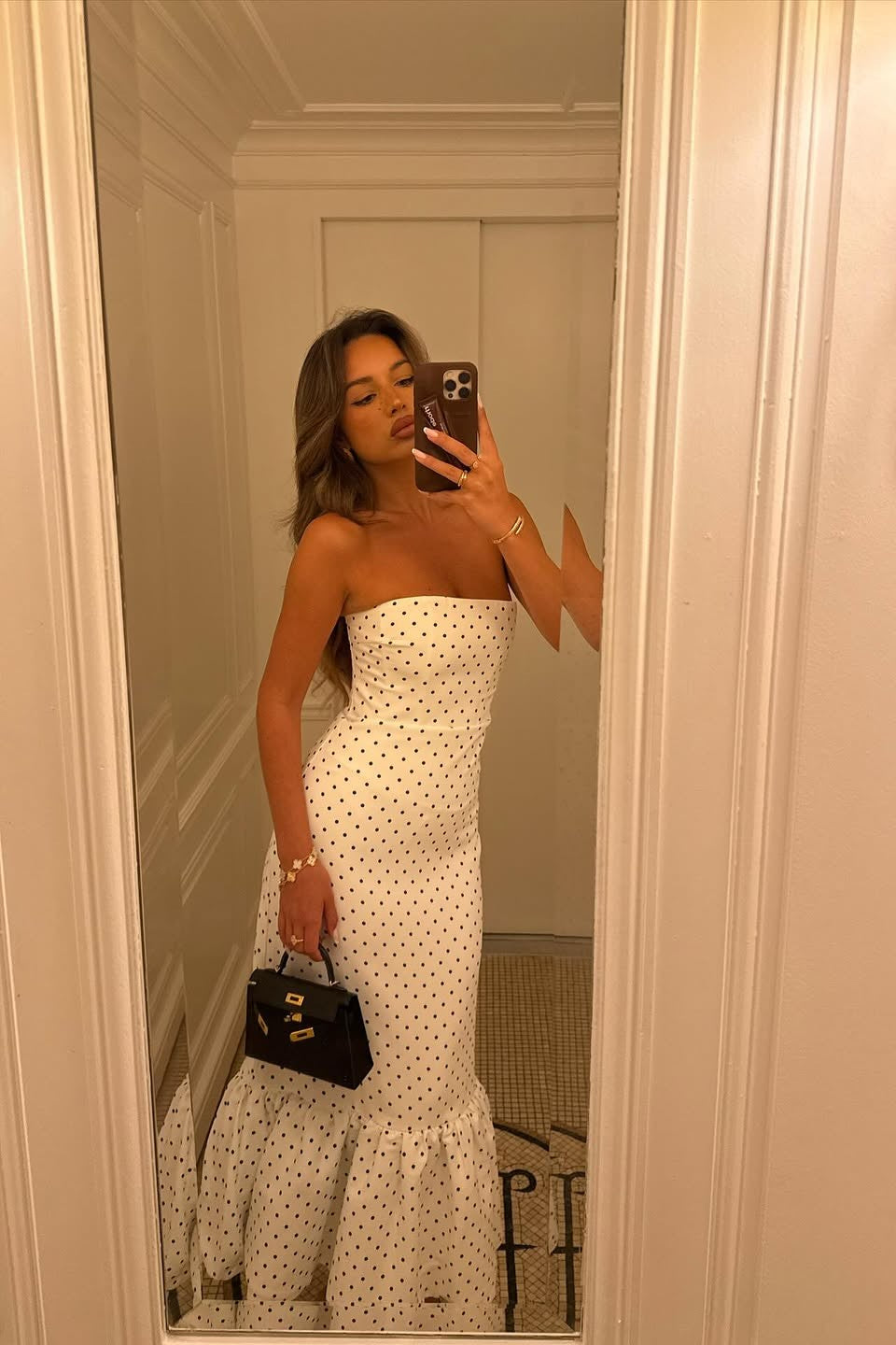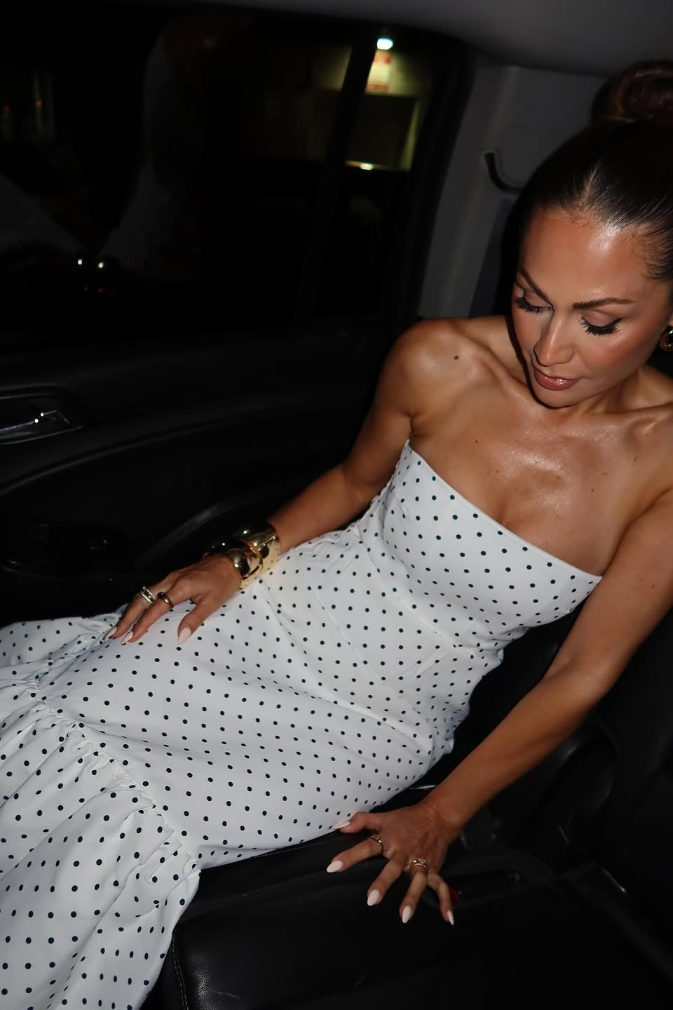 Slip into the playful elegance of Dulza, a strapless midi dress made to celebrate your natural femininity. Its premium stretch fabric gently embraces your curves, while the cheerful polka dot design adds a sweet vintage twist. With a flared hem that dances with your every move, Dulza is ideal for garden get-togethers, evening parties, or stylish urban outings.