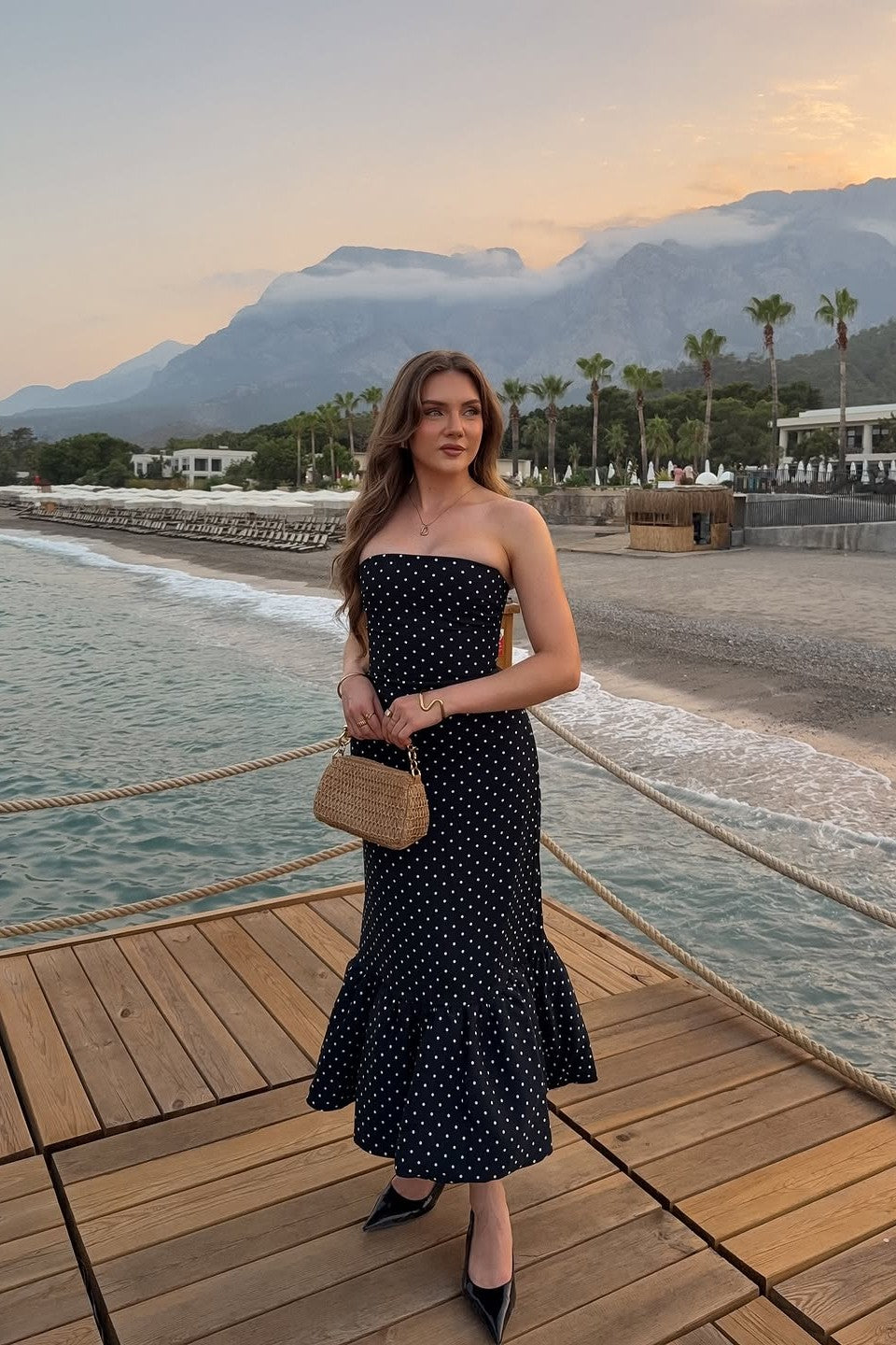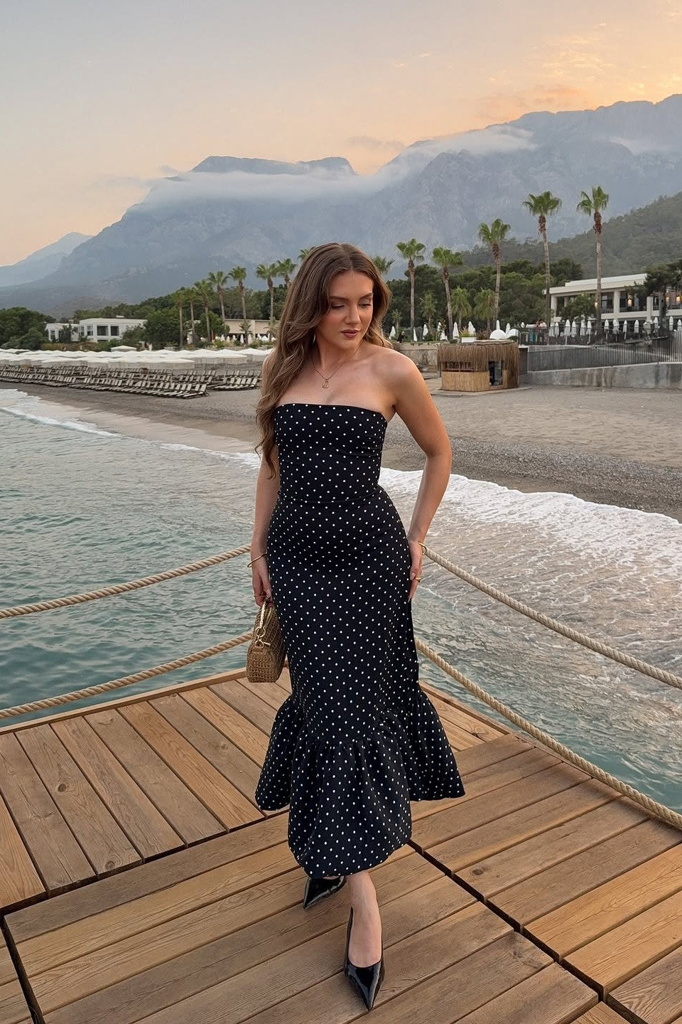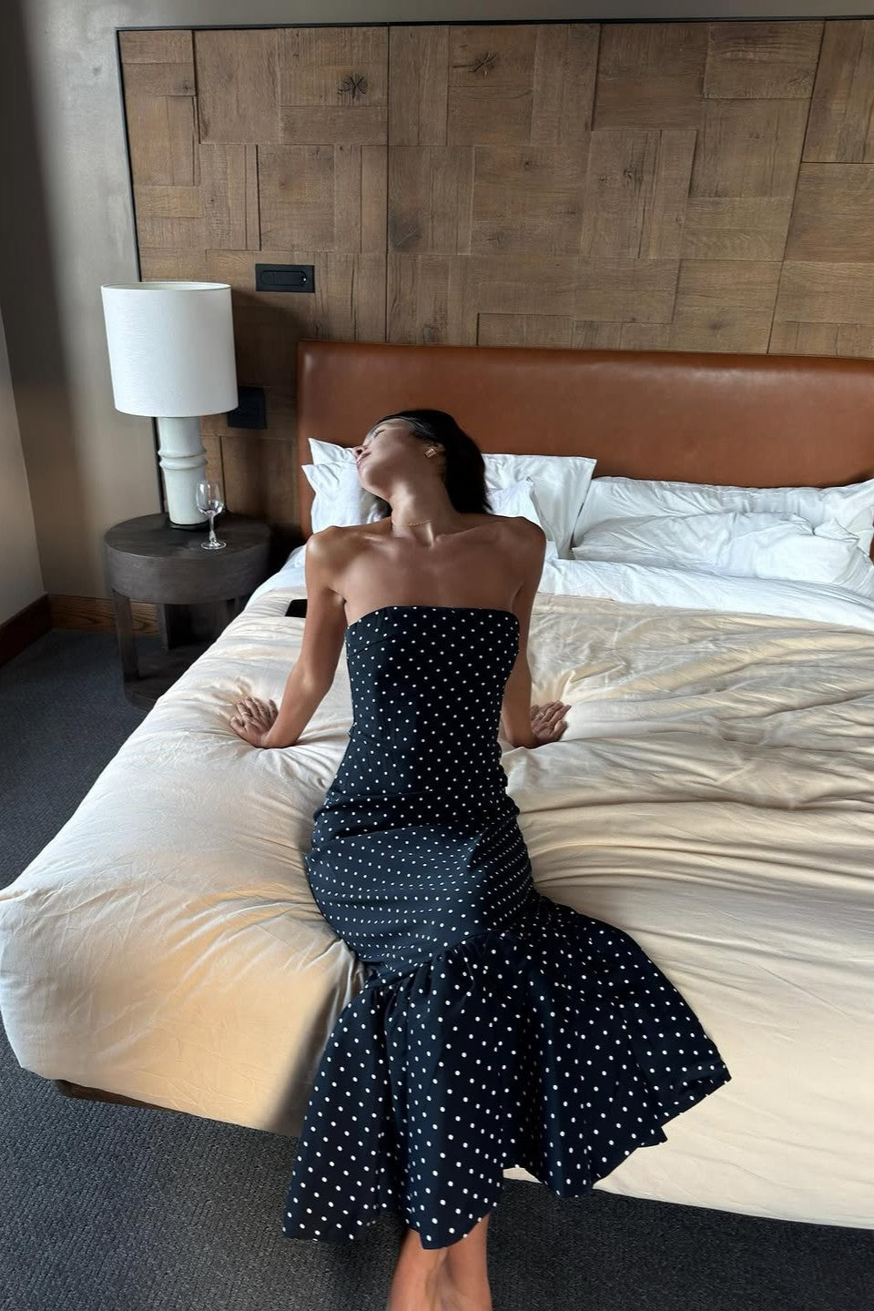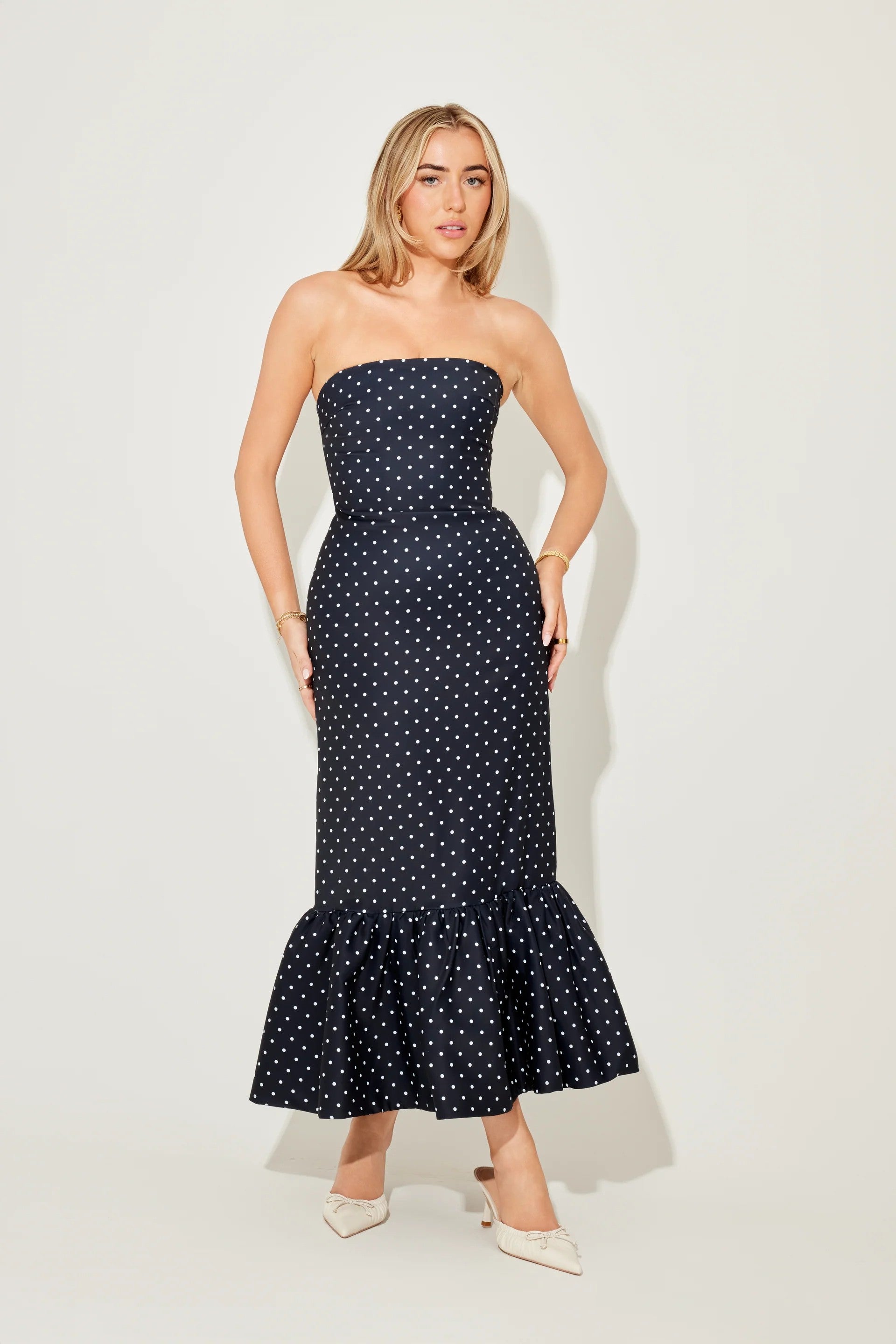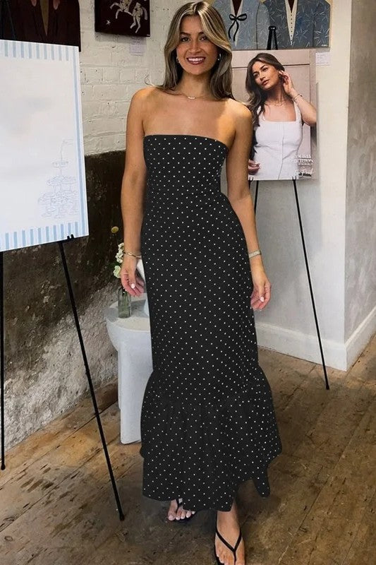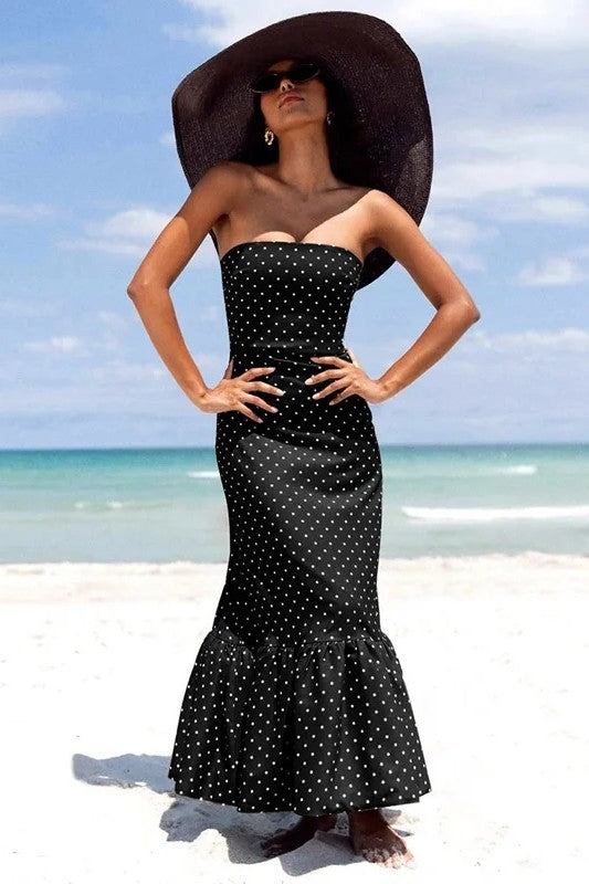 Slip into the playful elegance of Dulza, a strapless midi dress made to celebrate your natural femininity. Its premium stretch fabric gently embraces your curves, while the cheerful polka dot design adds a sweet vintage twist. With a flared hem that dances with your every move, Dulza is ideal for garden get-togethers, evening parties, or stylish urban outings.