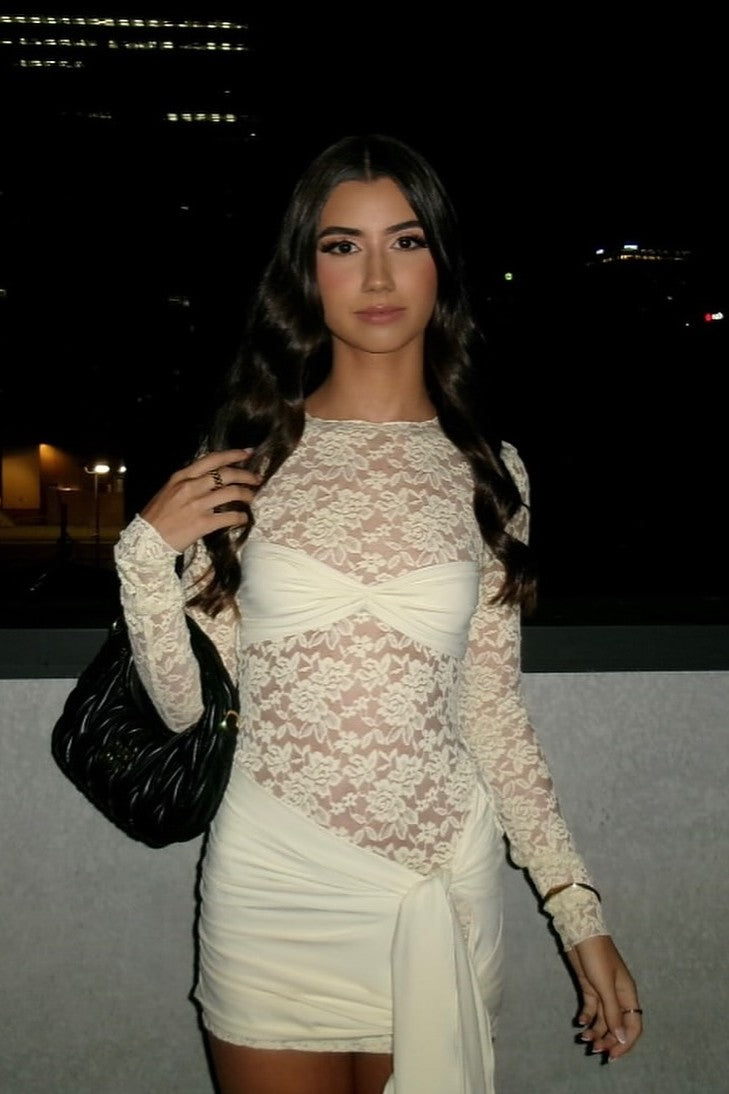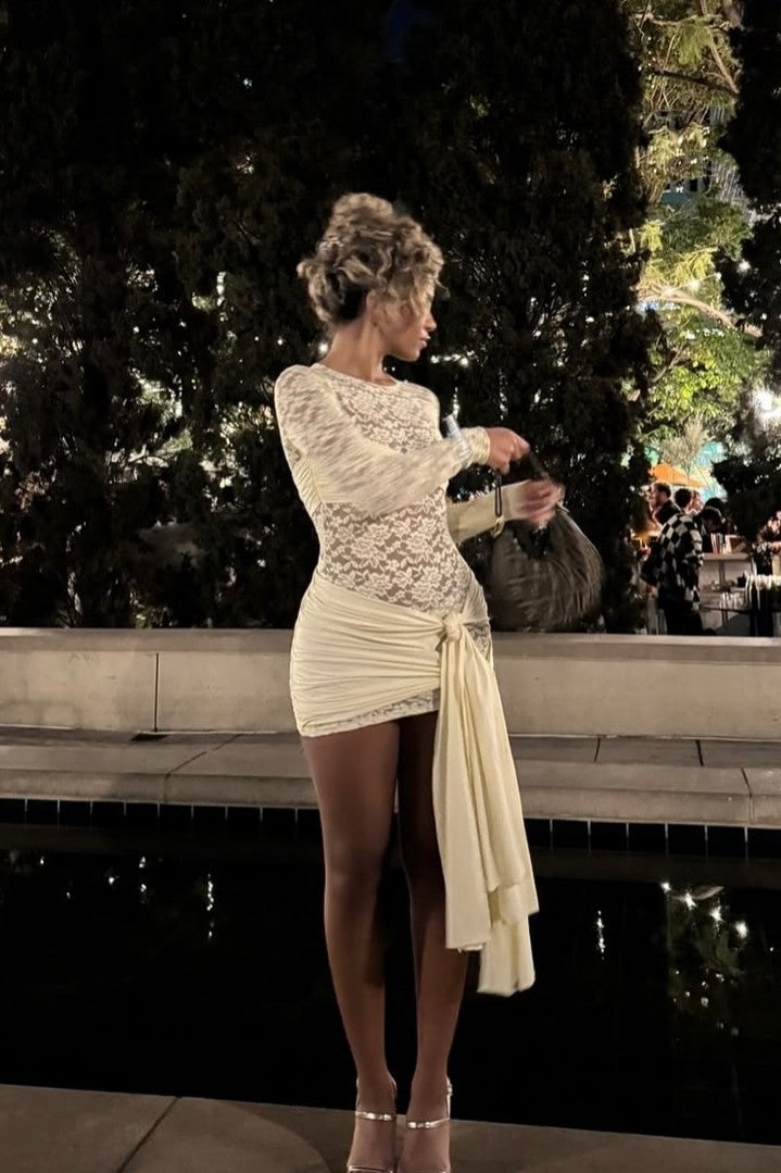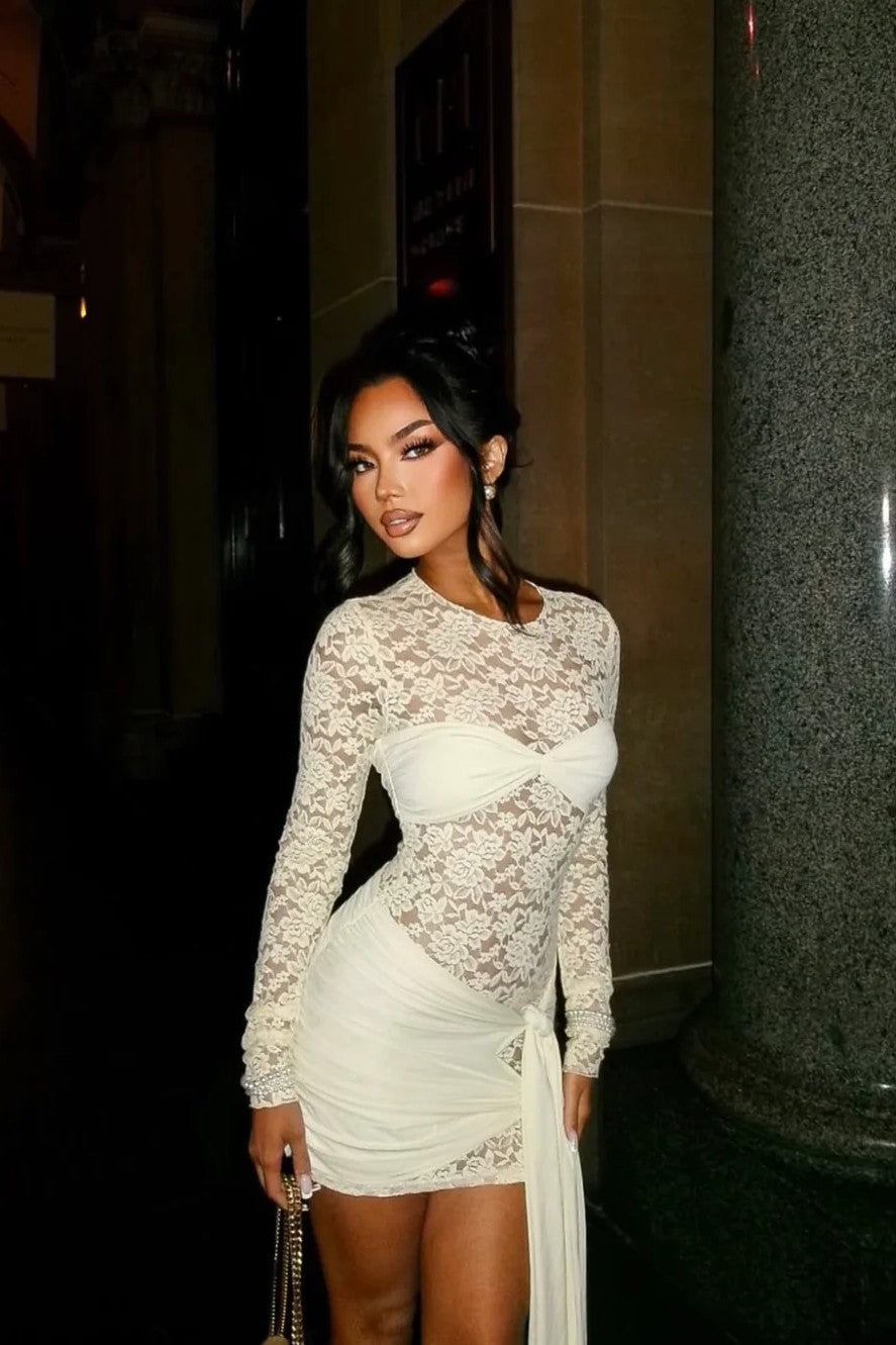 Show off your daring and flirty charm with Lehia, a mini dress made for confident style. This dress blends soft floral lace with trendy draped accents, featuring a bandeau-style bust that highlights your neckline and sheer long sleeves for a touch of mystery. Its close-fitting mini skirt is beautifully enhanced by a playful draped sash at the hip, bringing extra flair and movement. Ready to steal the spotlight? Lehia is your perfect partner for unforgettable nights out.