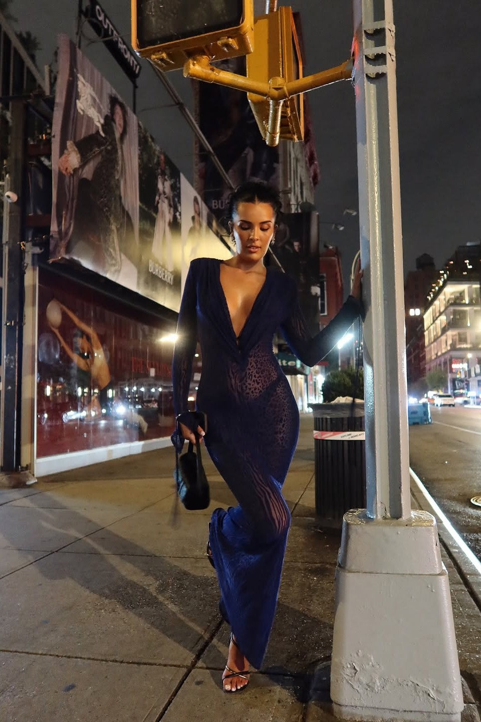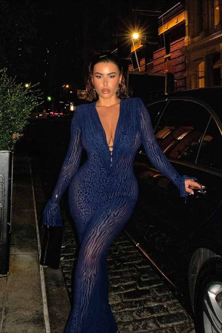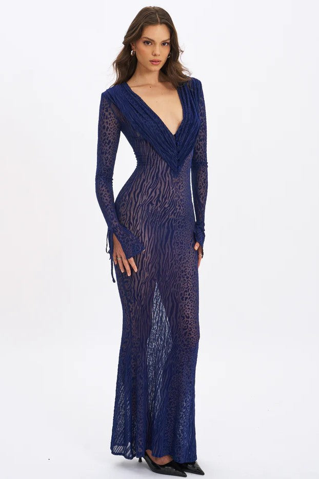 Channel unapologetic confidence with Lyssa, a daring maxi dress crafted for those who thrive in the spotlight. Designed with a bold sheer finish and a striking textured pattern, this figure-skimming silhouette brings sensuality and sophistication into perfect harmony. The deep V-neckline framed with layered, ruched detailing draws the eye, while the dramatic long sleeves and subtle flare hem create captivating movement. From its body-contouring fit to its statement-making design elements, Lyssa is made for unforgettable entrances.