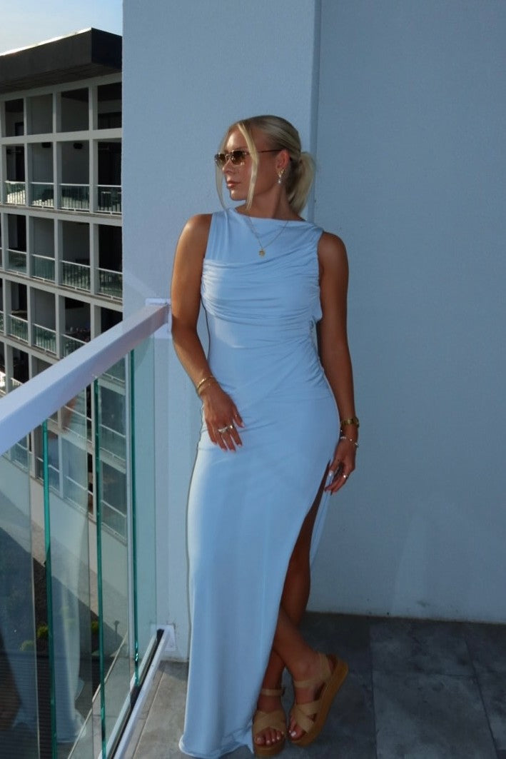 Elevate your evening look with Mela, a sophisticated maxi dress that blends timeless elegance with contemporary detailing. Designed with a softly draped neckline and artful ruching at the waist, this piece creates a flattering silhouette that enhances your natural shape. The daring thigh-high split adds a touch of allure, making Mela the perfect choice for special occasions where refined glamour meets modern edge.