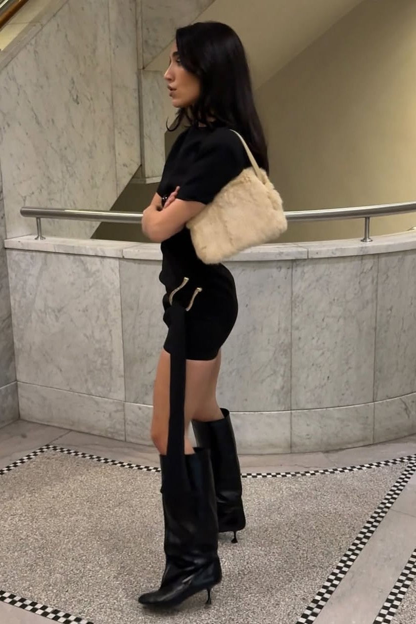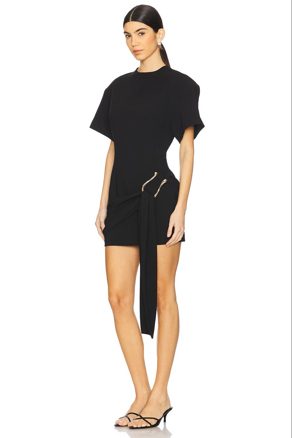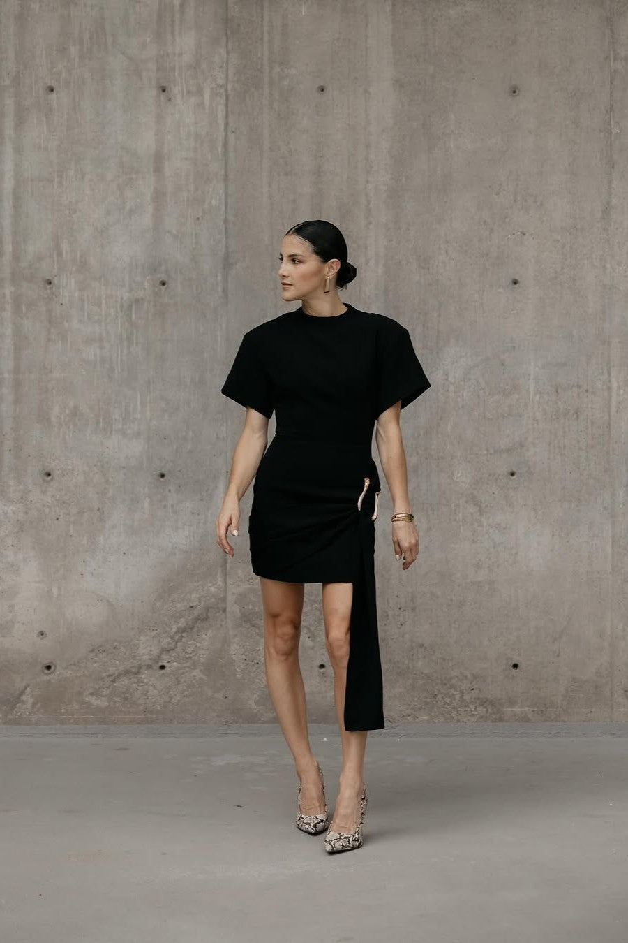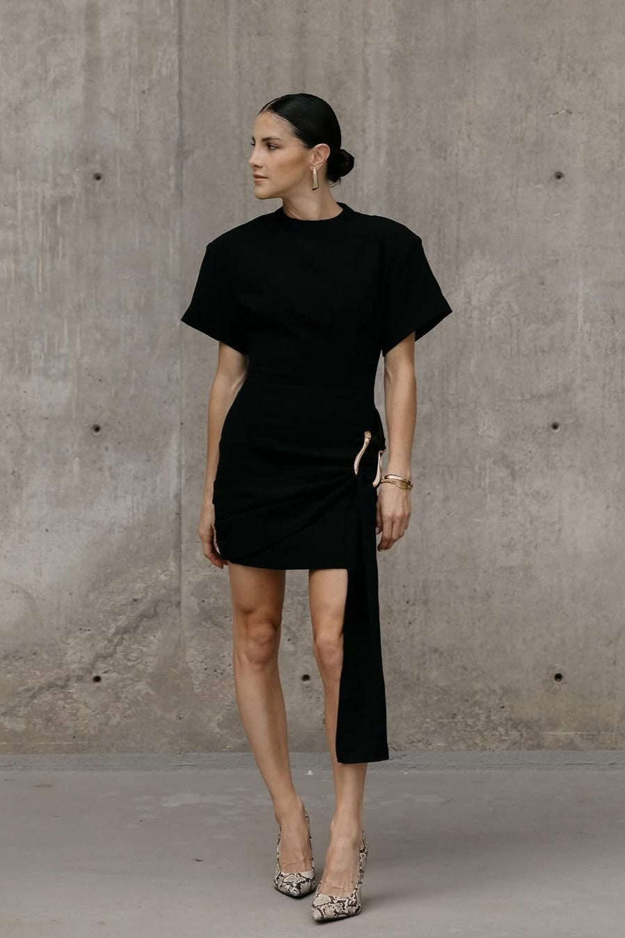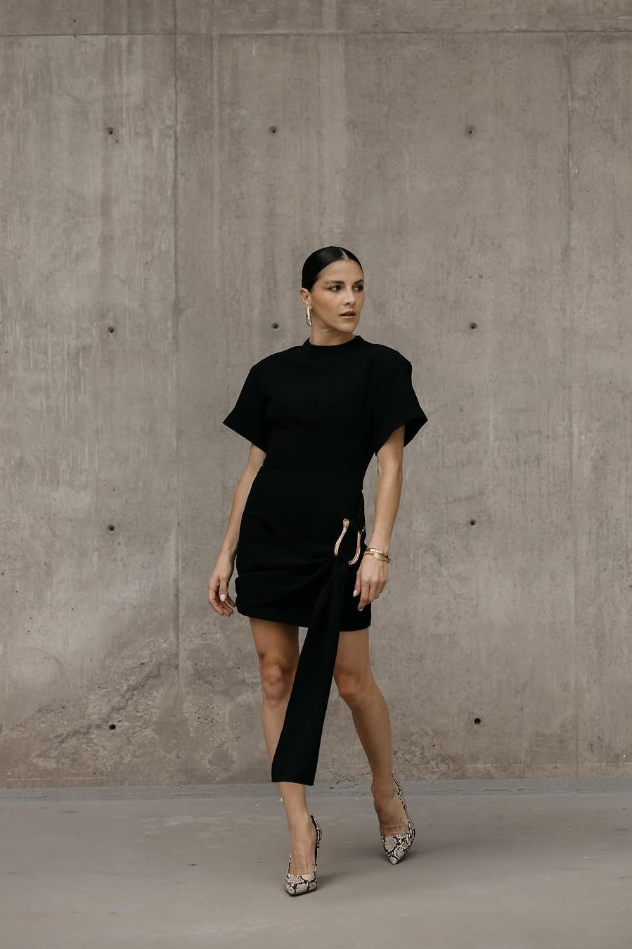 Introducing Milika, the mini dress that's ready for your most glamorous moments. With its sharp tailoring and contemporary edge, this piece combines a refined high neckline with generous wide sleeves for an effortlessly polished look. The fitted waist accentuates your silhouette while the signature draped side panel—finished with a sleek metal ring—adds movement and visual interest. Perfect for cocktail hours and nights out, Milika delivers that coveted mix of modern elegance and undeniable attitude.