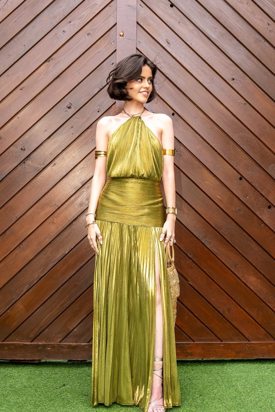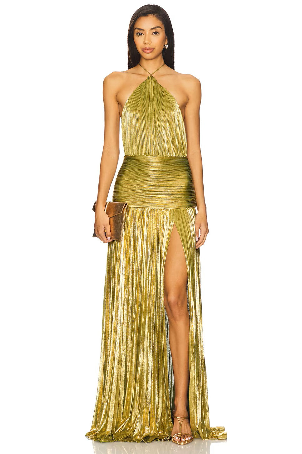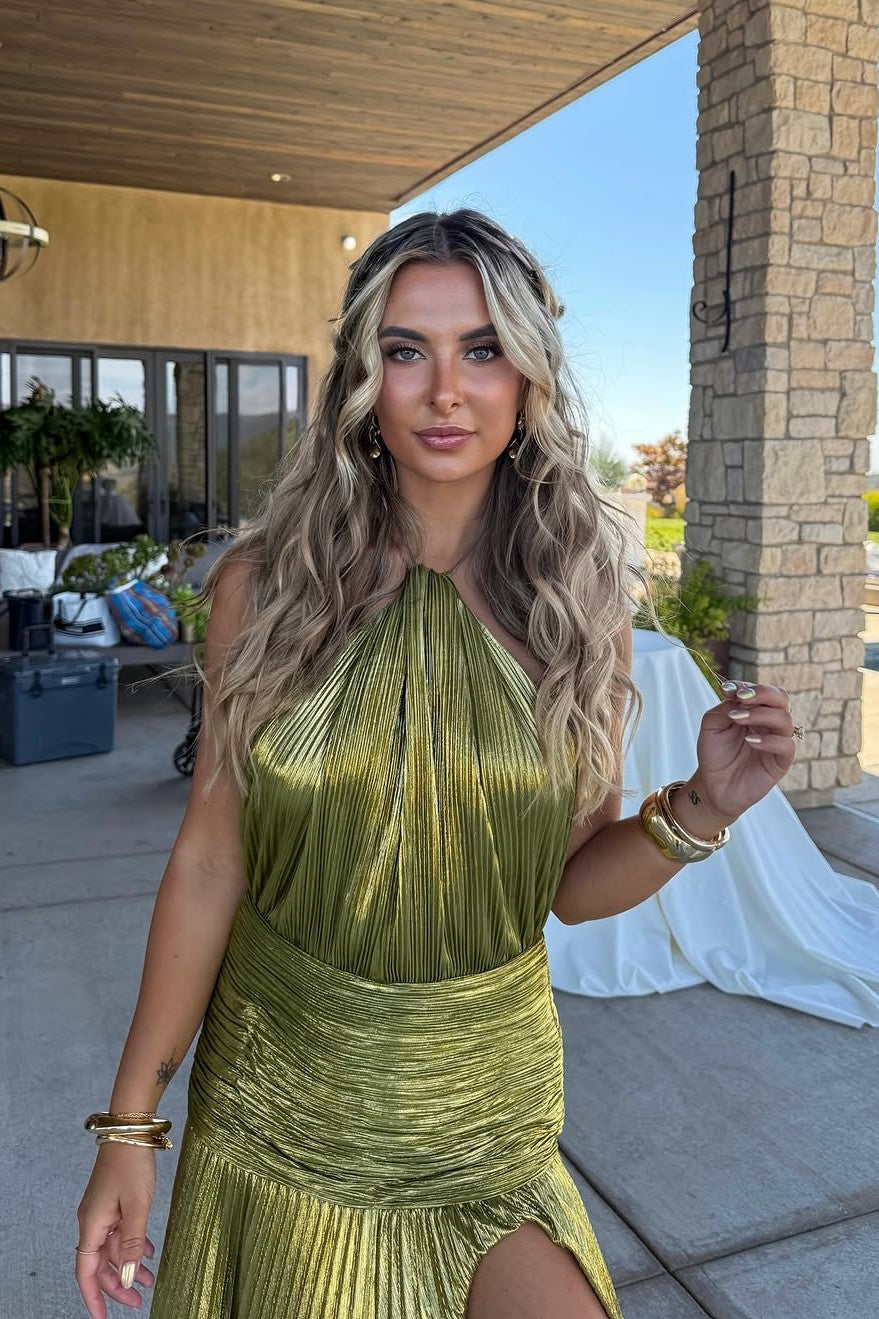 Unleash your goddess energy with Plune, a statement gown made for dramatic entrances. Crafted with luxe pleated fabric that catches the light from every angle, this halter-style dress flows effortlessly over the body. The cinched waistband defines your silhouette, while the daring thigh-high split adds just the right touch of sultry allure. Perfect for evenings where you want to command attention, Plune is pure elegance reimagined.
