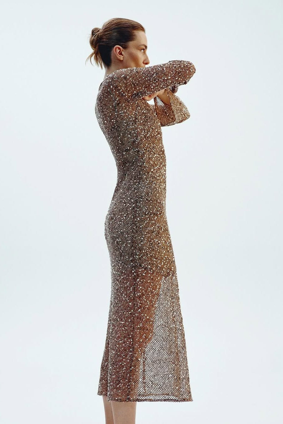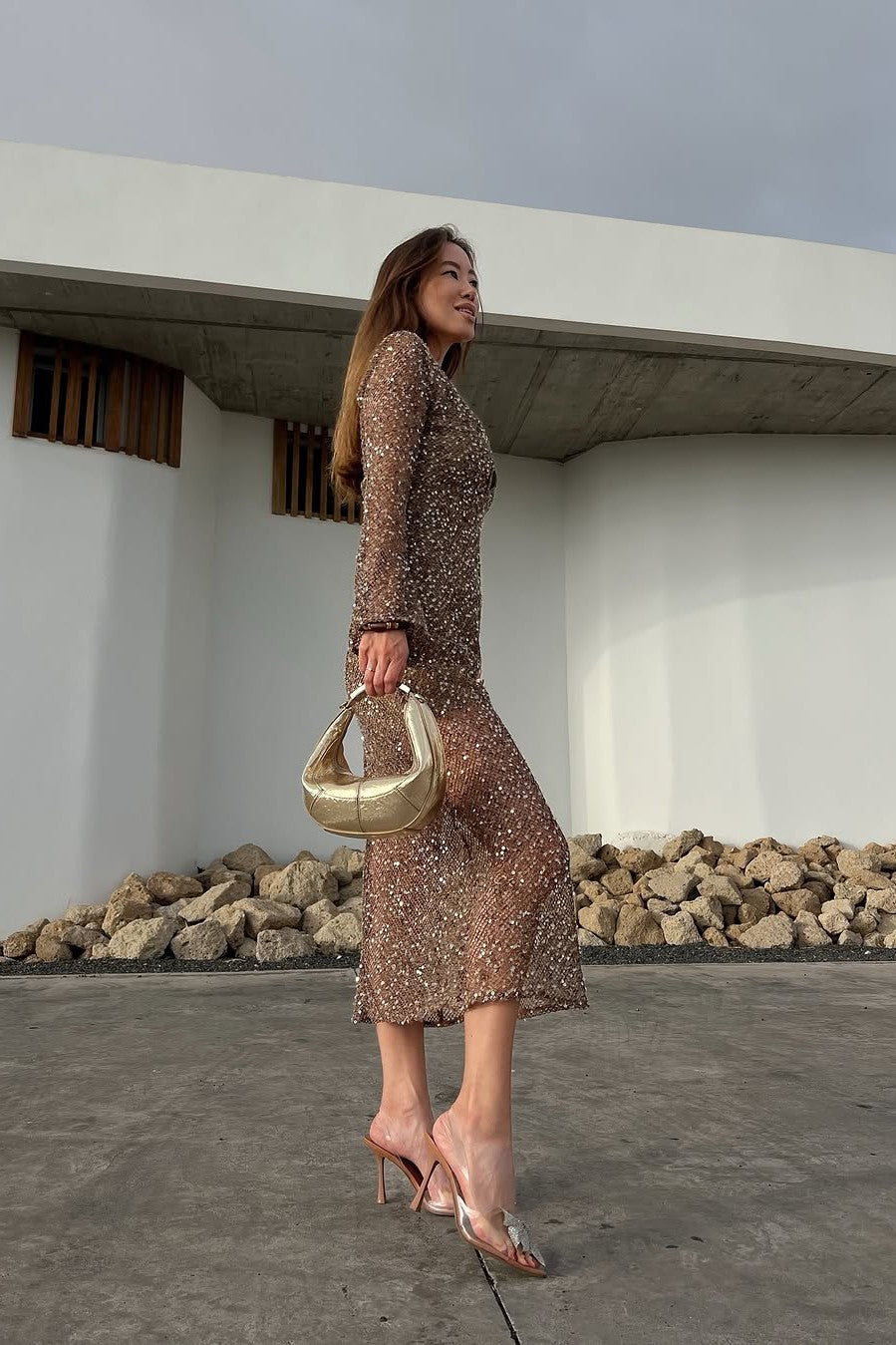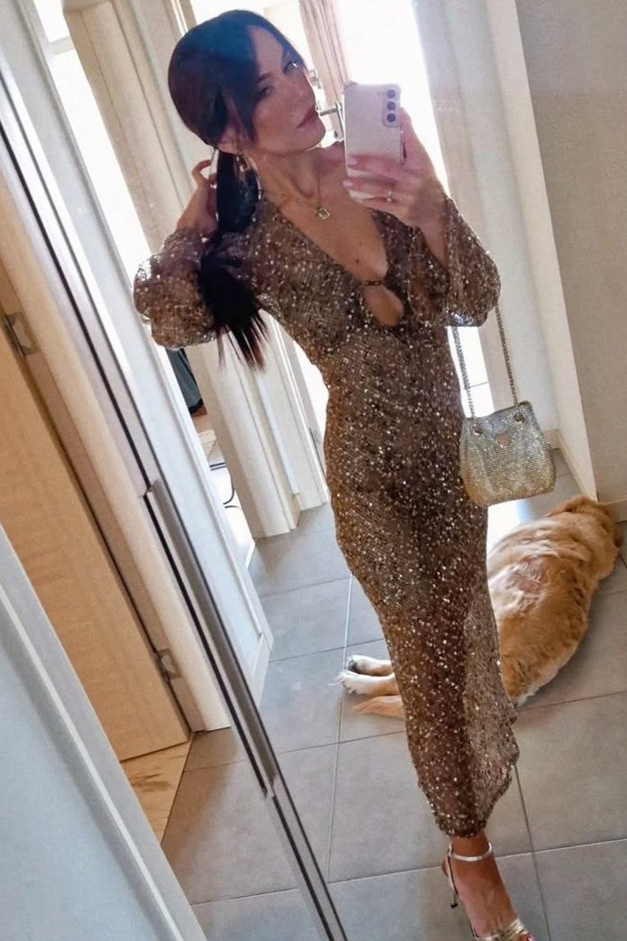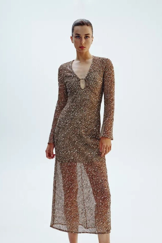 Dazzle with effortless sophistication in Serina, a shimmering midi dress designed to captivate. Crafted from a sheer, sequin-embellished mesh, this piece beautifully catches the light with every movement. Featuring a flattering deep neckline with a subtle keyhole detail and long fitted sleeves, Serina exudes understated glamour. Perfect for evening soirées or upscale events where you want to make a lasting impression.
