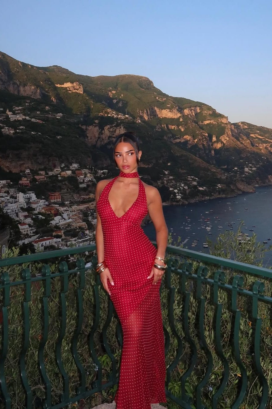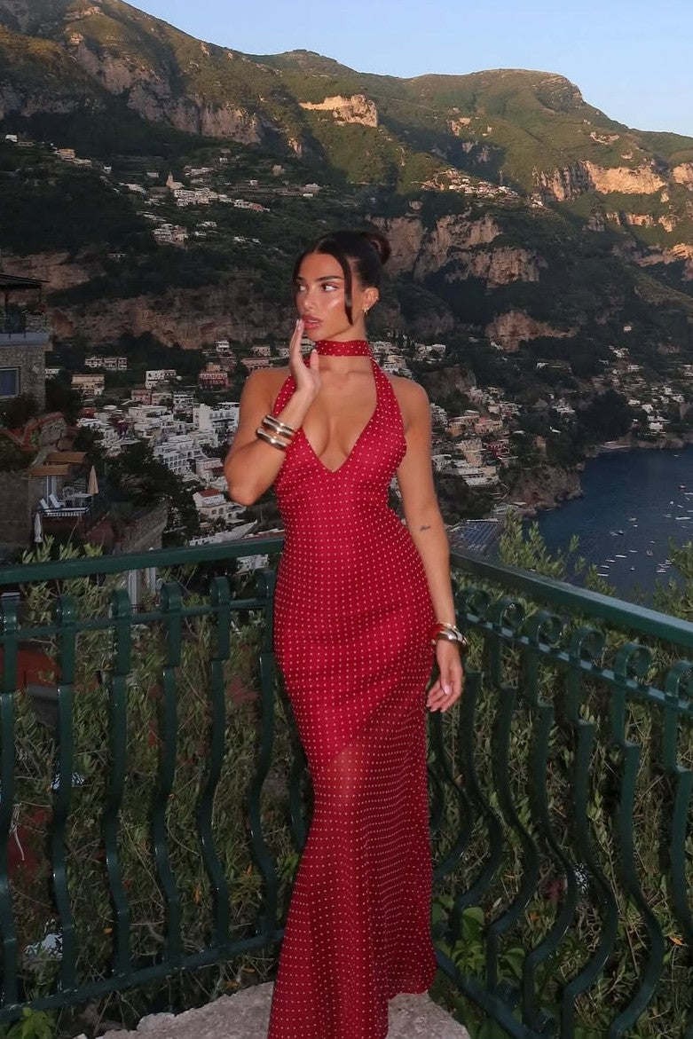 Unleash your inner allure with Tuula, a captivating long dress made for nights that call for effortless glamour. This halter-style silhouette drapes beautifully over the body, showcasing a plunging neckline and open-back design that exudes confident sensuality. Crafted from a sheer, dotted fabric that catches the light with every move, Tuula embodies understated luxury with a sultry edge. Perfect for romantic evenings or sunset soirées by the sea, this dress was made to be unforgettable.