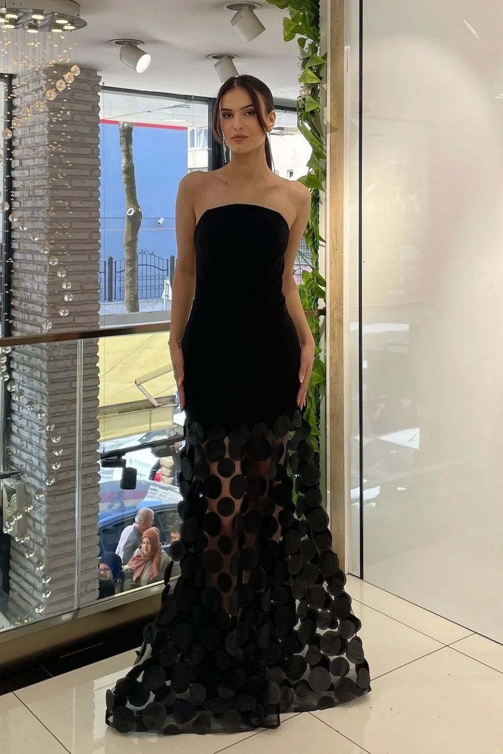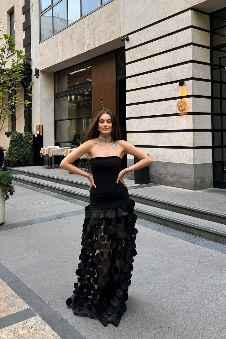 Steal the spotlight in Yana, a statement dress that blends sleek sophistication with artistic allure. Featuring a structured strapless bodice that sculpts the figure and a sheer tulle skirt adorned with voluminous circular appliqués, this gown captures movement and light with every step. Bold yet graceful, Yana is the definition of modern glamour.