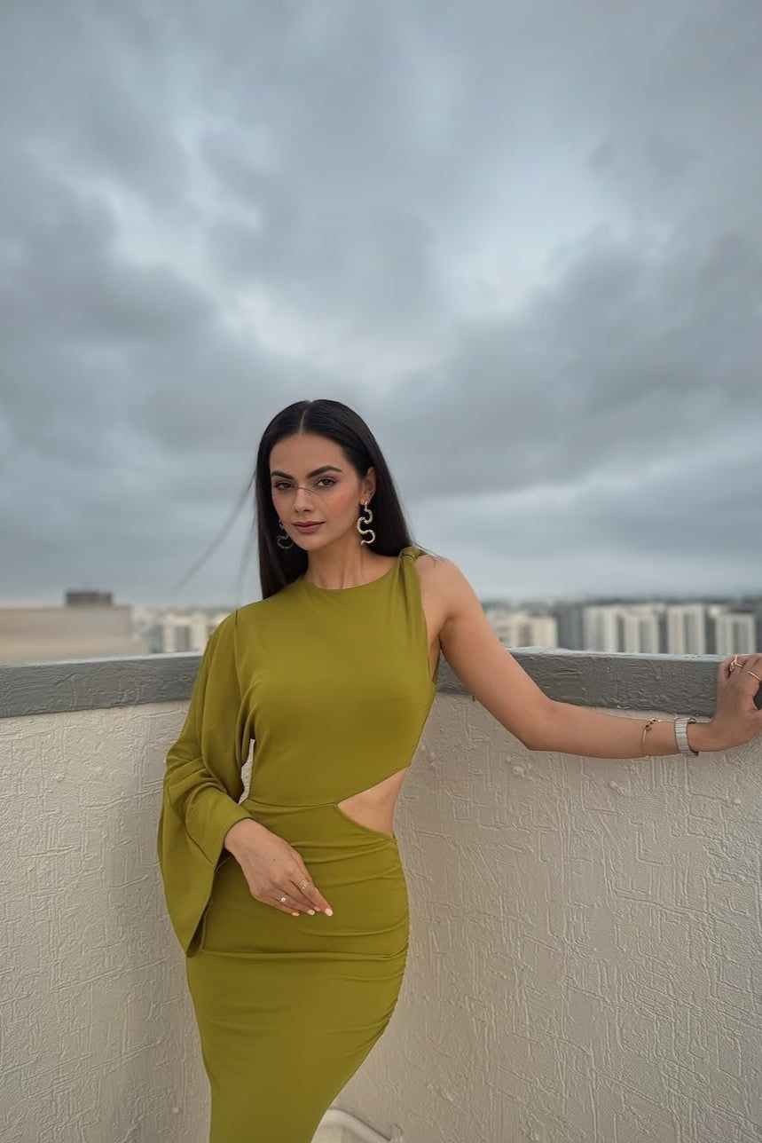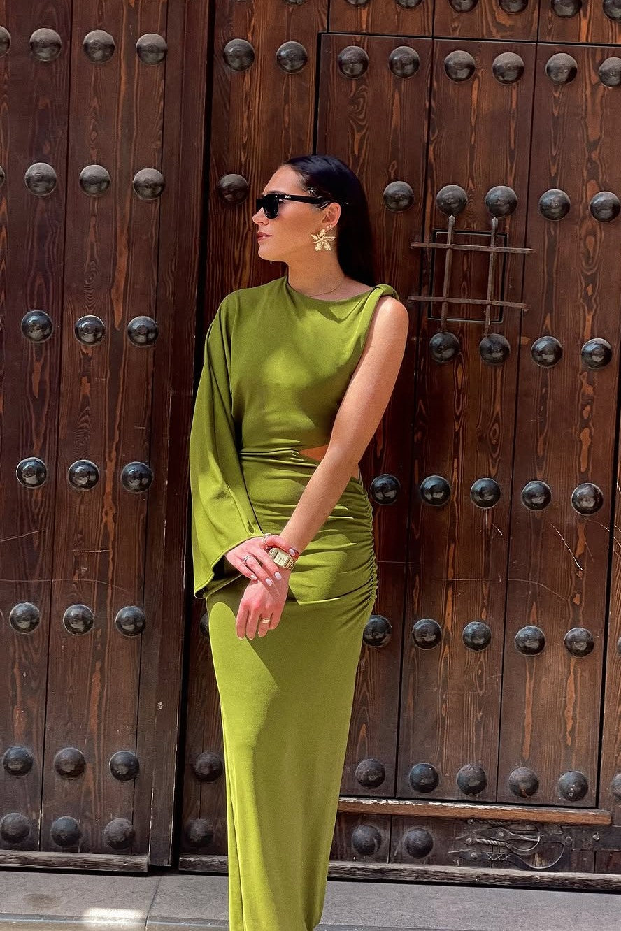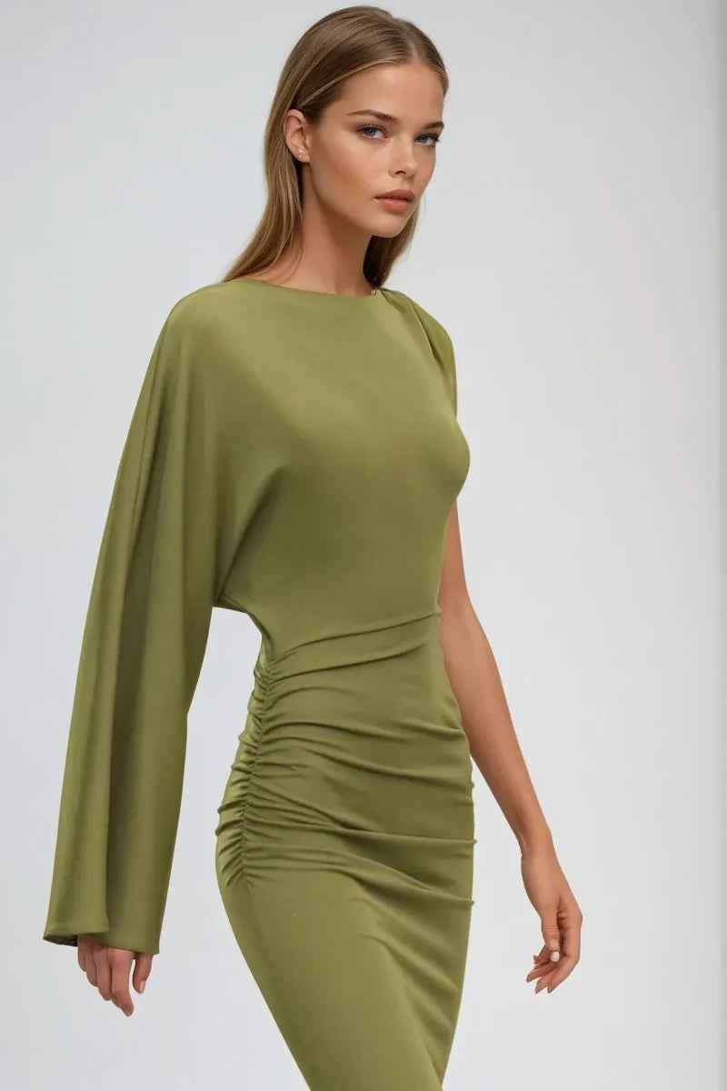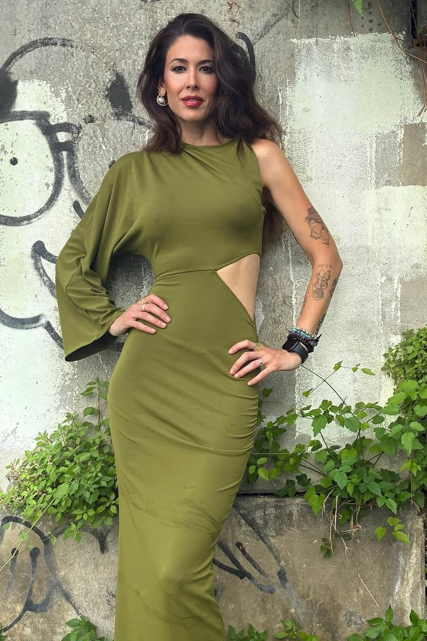Step into high-impact sophistication with Caline, a daring asymmetric dress that redefines modern elegance. Crafted for the woman who commands attention, this piece features a striking one-shoulder silhouette with a dramatic long sleeve on one side and a sleeveless cut on the other. A bold side cut-out at the waist adds intrigue, while gathered ruching along the hips enhances and flatters your natural curves. The sleek, form-fitting design flows into a maxi-length skirt, making Caline an unforgettable choice for evenings where style and edge collide.