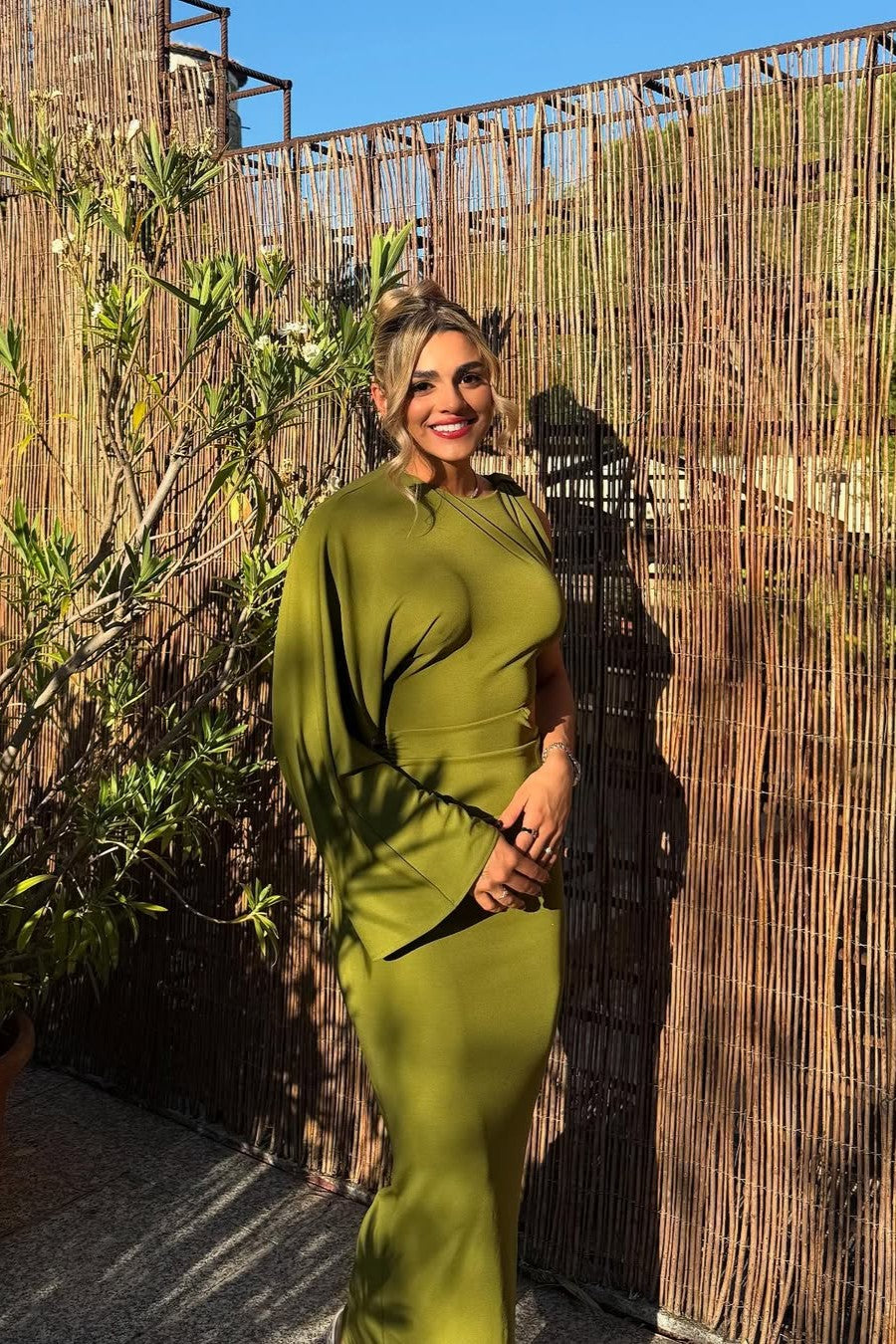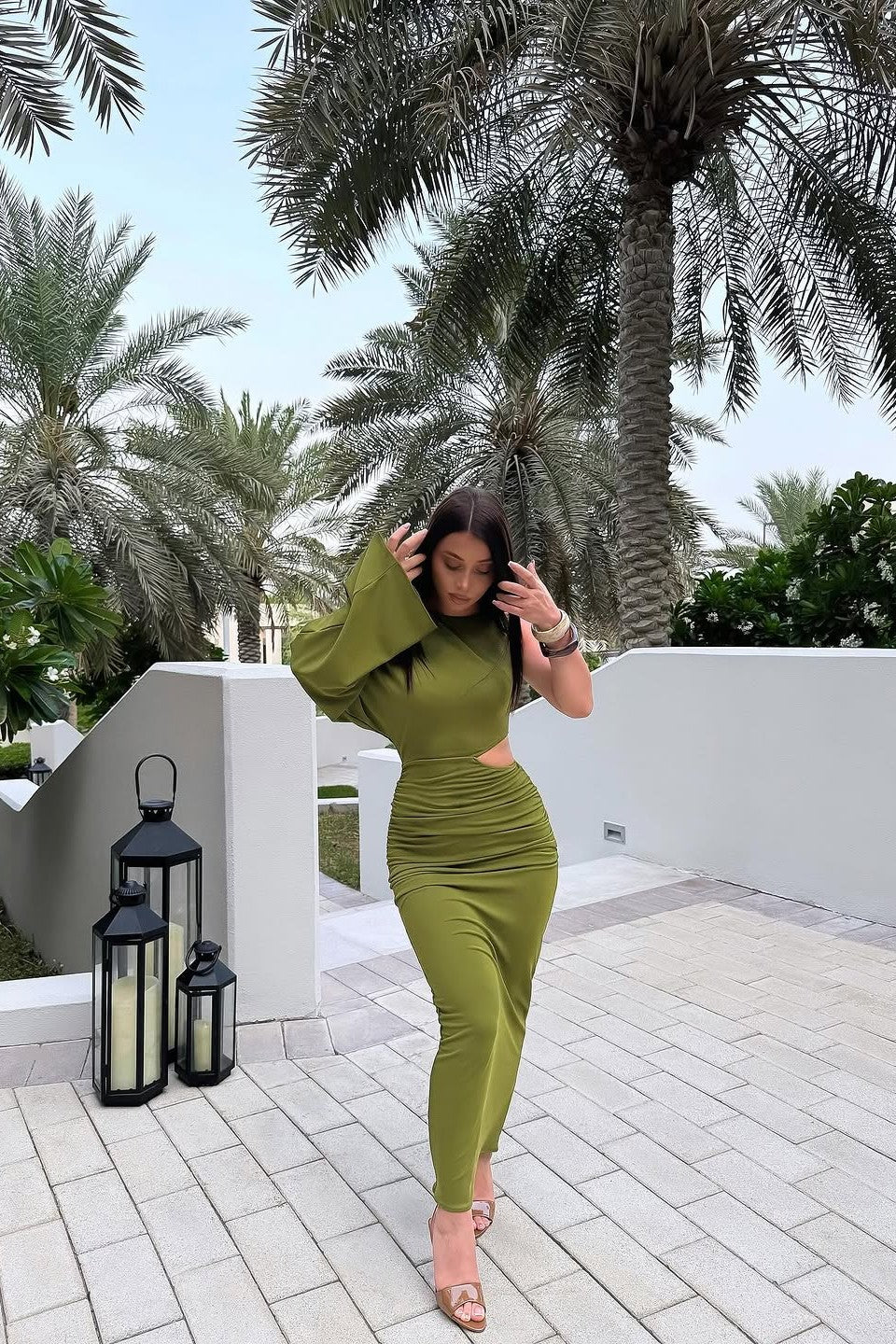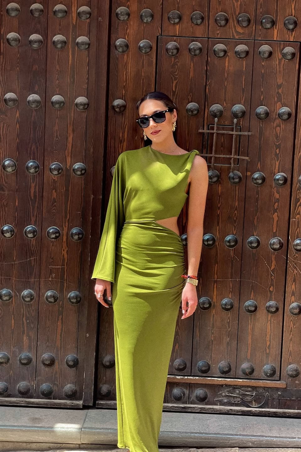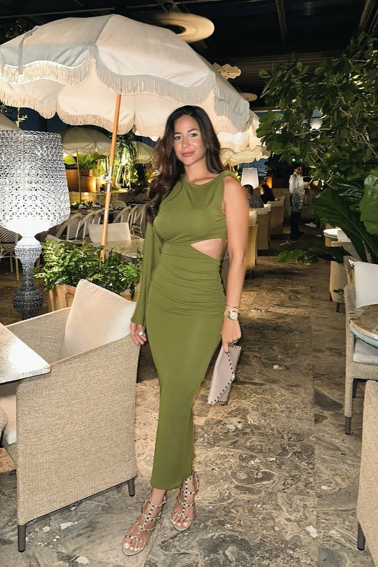 Step into high-impact sophistication with Caline, a daring asymmetric dress that redefines modern elegance. Crafted for the woman who commands attention, this piece features a striking one-shoulder silhouette with a dramatic long sleeve on one side and a sleeveless cut on the other. A bold side cut-out at the waist adds intrigue, while gathered ruching along the hips enhances and flatters your natural curves. The sleek, form-fitting design flows into a maxi-length skirt, making Caline an unforgettable choice for evenings where style and edge collide.