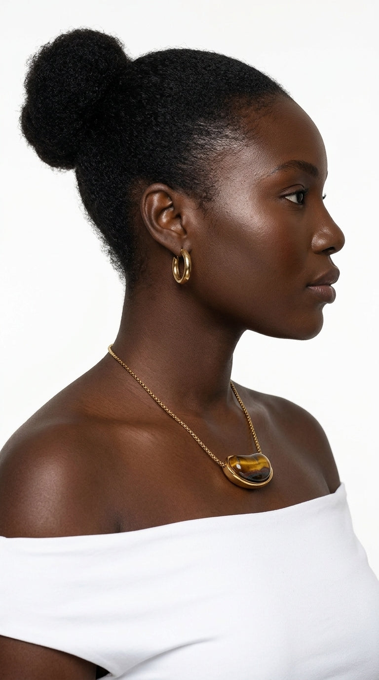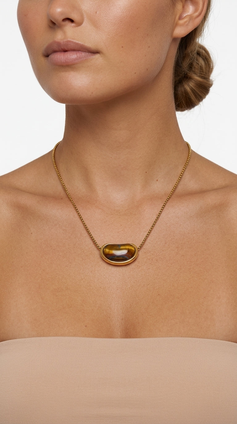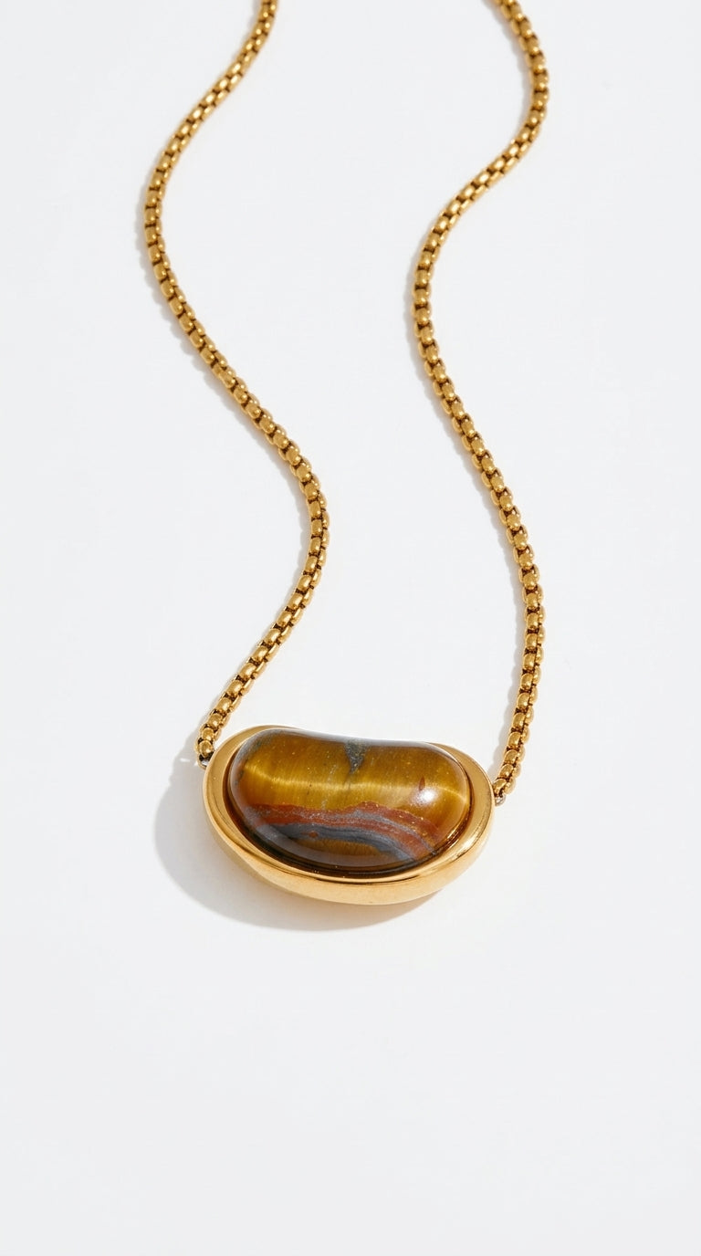 Sculptural, warm, and irresistibly tactile — the Cressida Necklace centers a polished tiger eye bean pendant on a fine gold box chain, creating a piece that feels both contemporary art and wearable treasure. The stone's swirling amber and sienna bands seem to glow from within.