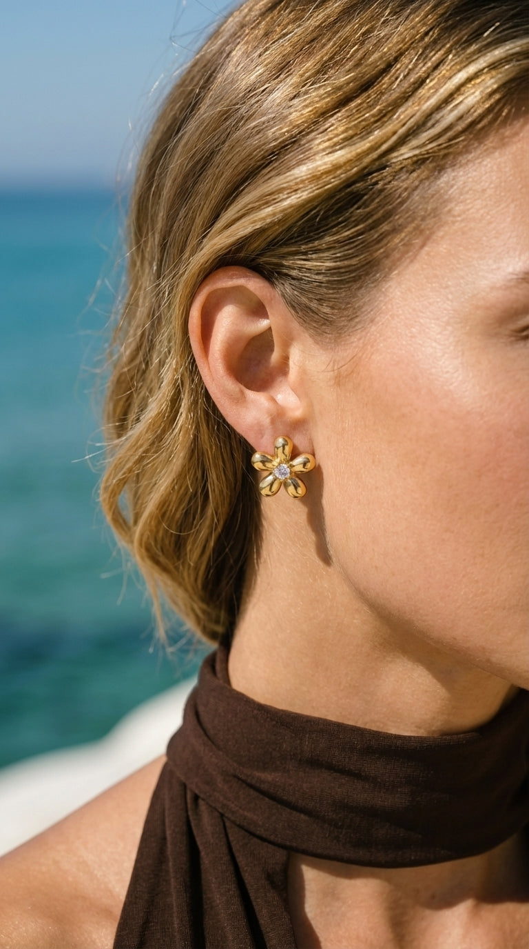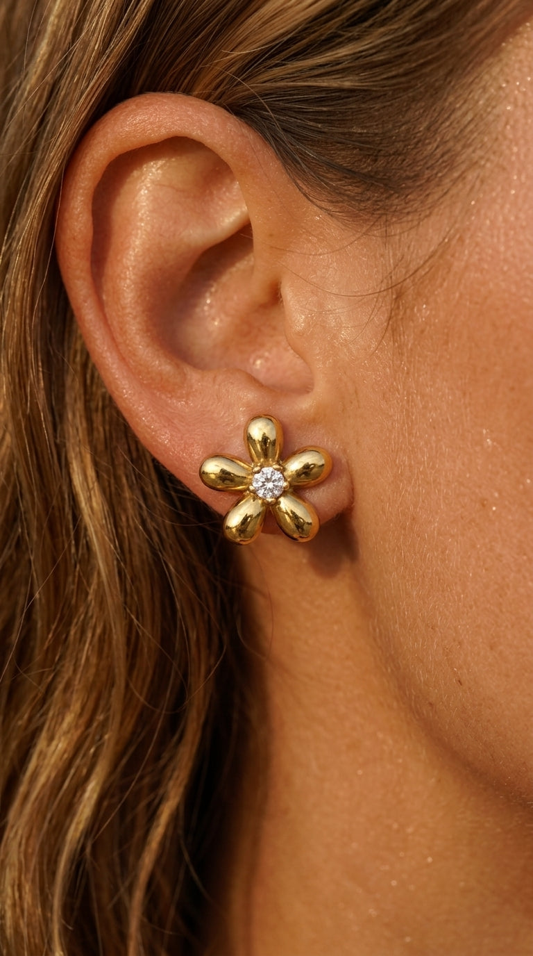 Perpetual bloom. The Héloïse studs sculpt five golden petals around a single sparkling zirconia center, capturing the essence of a garden in eternal spring. Small enough for everyday, striking enough to be noticed.