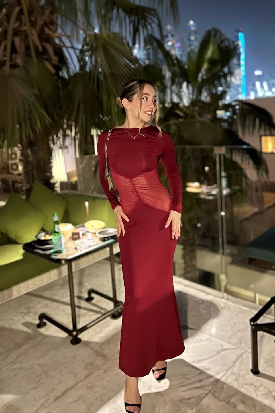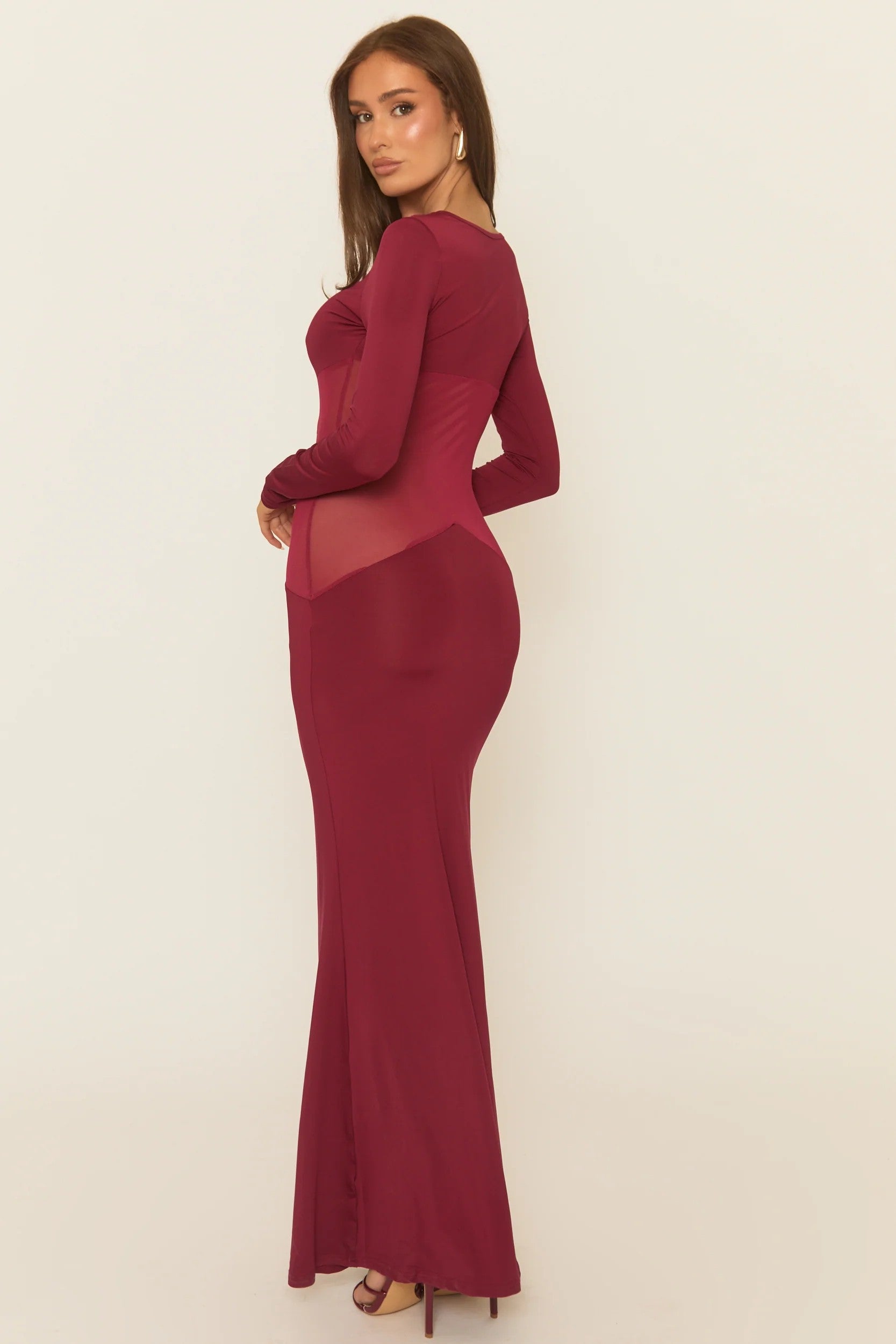 Rule the evening in Rachelle, a sculpting maxi dress designed to command attention with its seamless blend of allure and sophistication. Crafted from luxurious stretch jersey, this piece features a sleek high neckline and long fitted sleeves for an elegant silhouette. The sheer mesh midsection with delicate ruching enhances your natural curves, offering a daring yet refined contrast. Finished with a floor-length hem that elongates the figure, Rachelle is the definition of modern sensuality — bold, sleek, and unforgettable.