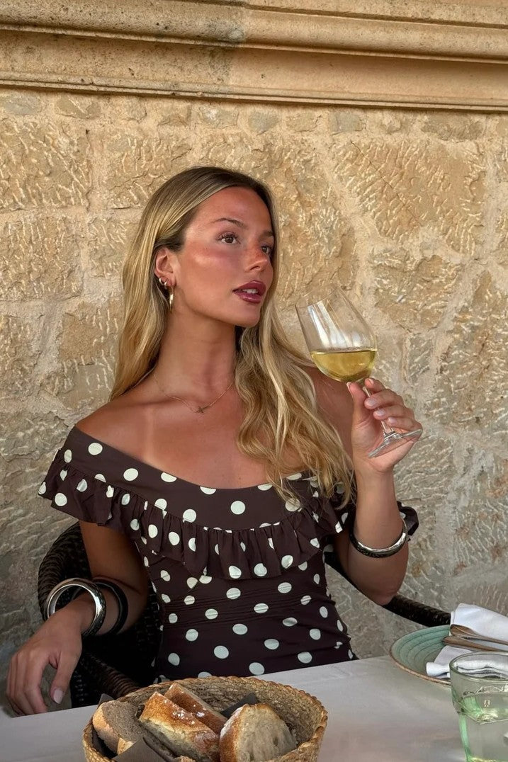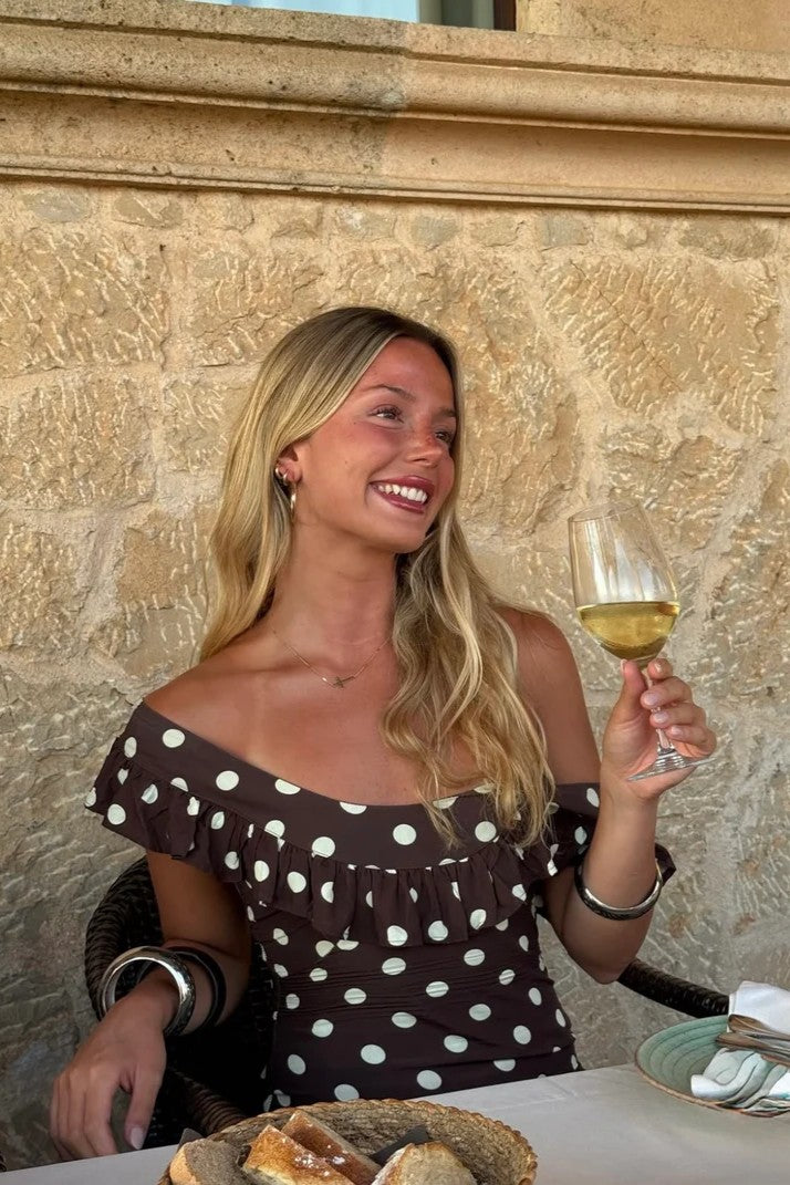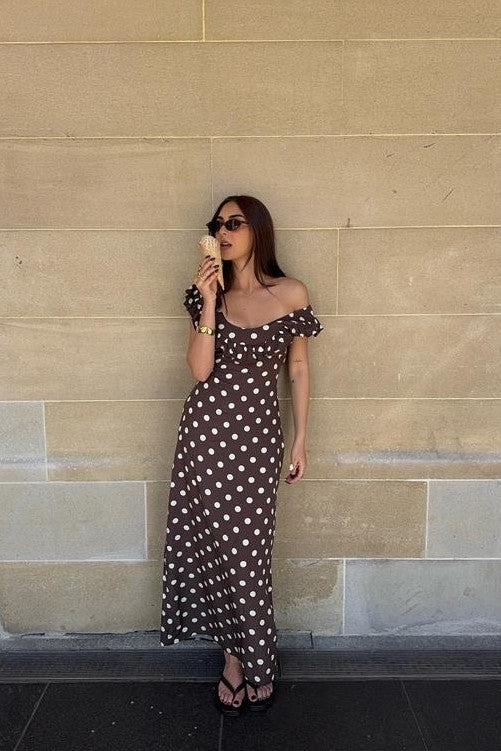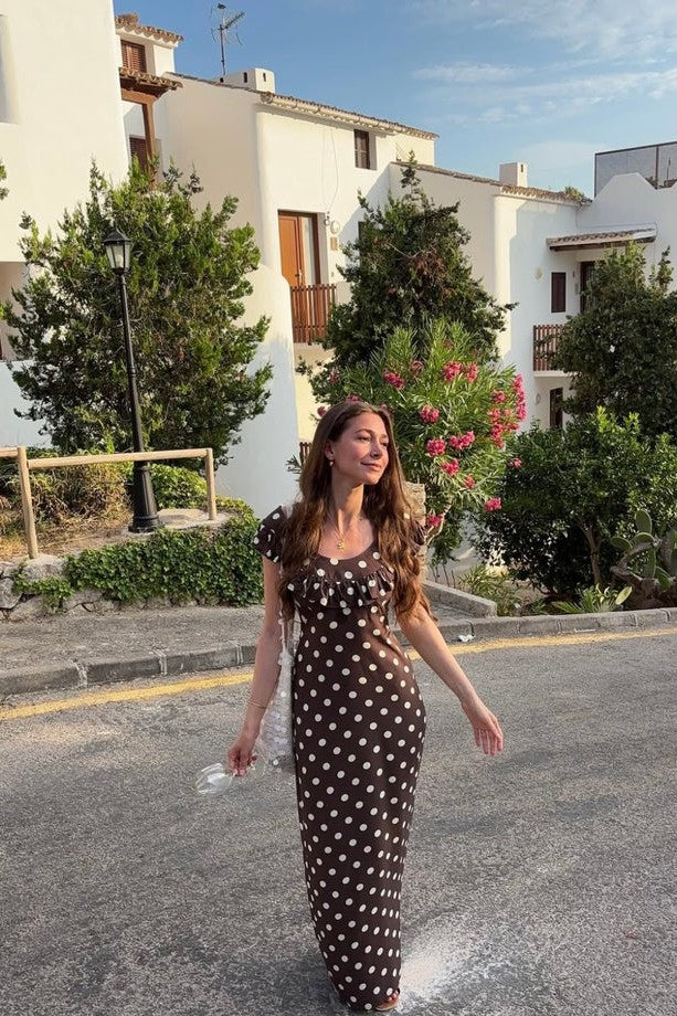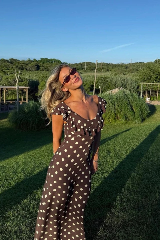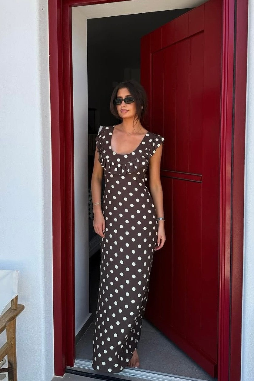 Embrace classic femininity with Abbelle, a playful polka dot maxi dress made for relaxed elegance. Its soft, high-quality fabric flows effortlessly, while the ruffled neckline and sweet cap sleeves bring a flirty vibe. The long, sweeping design is ideal for sunny brunches, summer adventures, or magical nights out. Comfortable and charming, Abbelle is the dress you'll want to wear again and again.