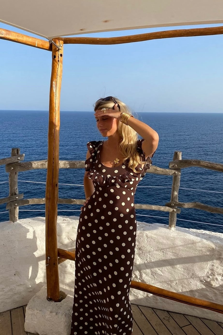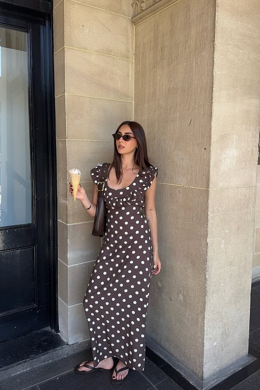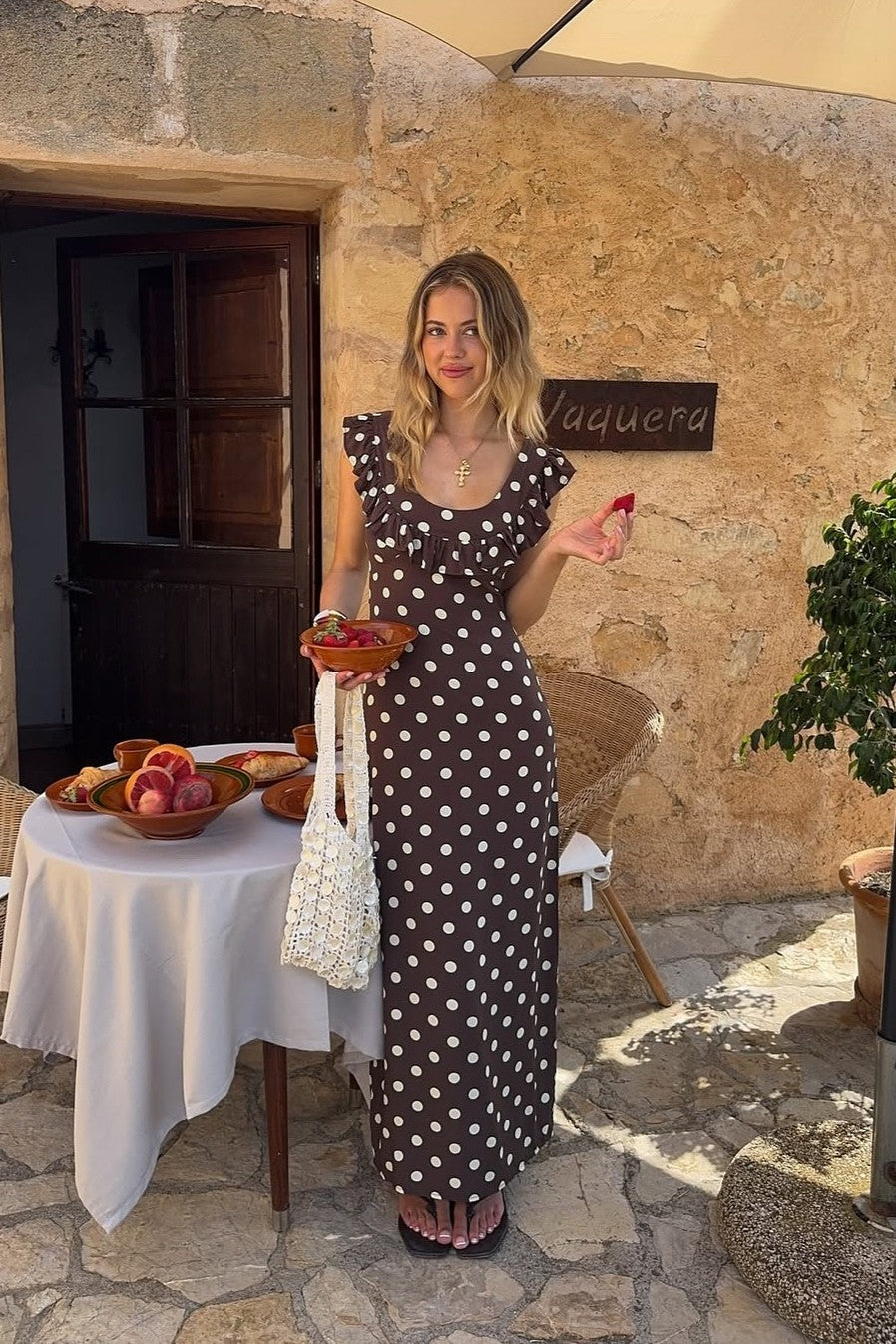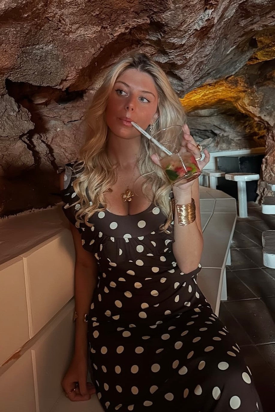 Embrace classic femininity with Abbelle, a playful polka dot maxi dress made for relaxed elegance. Its soft, high-quality fabric flows effortlessly, while the ruffled neckline and sweet cap sleeves bring a flirty vibe. The long, sweeping design is ideal for sunny brunches, summer adventures, or magical nights out. Comfortable and charming, Abbelle is the dress you'll want to wear again and again.