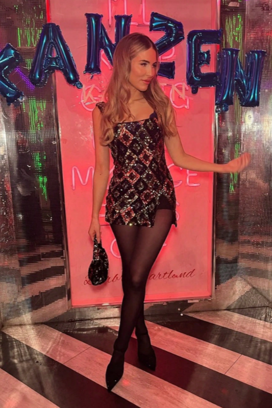 Elevate your evening wardrobe with Ecurina, a sophisticated mini dress designed for those who appreciate refined glamour. Featuring a sculpted square neckline and structured shoulder straps that accentuate the shoulders, this piece combines architectural elegance with sensual appeal. Luminous sequin embroidery adorns the fabric, creating depth and radiance, while the fitted silhouette flatters your form with understated confidence. A graceful front slit introduces movement and poise, making Ecurina an exceptional choice for upscale events, getaways, and occasions demanding timeless sophistication.